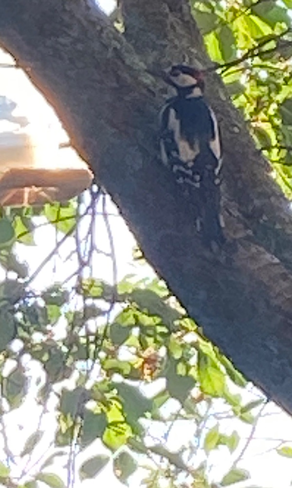 Поделюсь случайным фото, правда качество фото не очень 🧐, но только так сумела среагировать. Нас навестил пестрый дятел. Прямо на участке возле дома ^Y Такой красавчик! ::P
