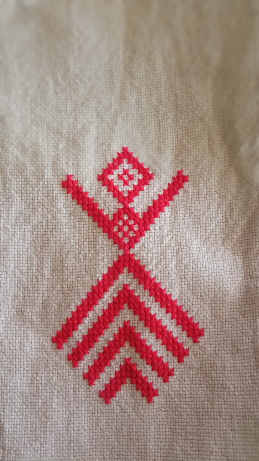На сумочке для телефона( из лоскутков льна сшитой) вышита Макошь, как оберег..