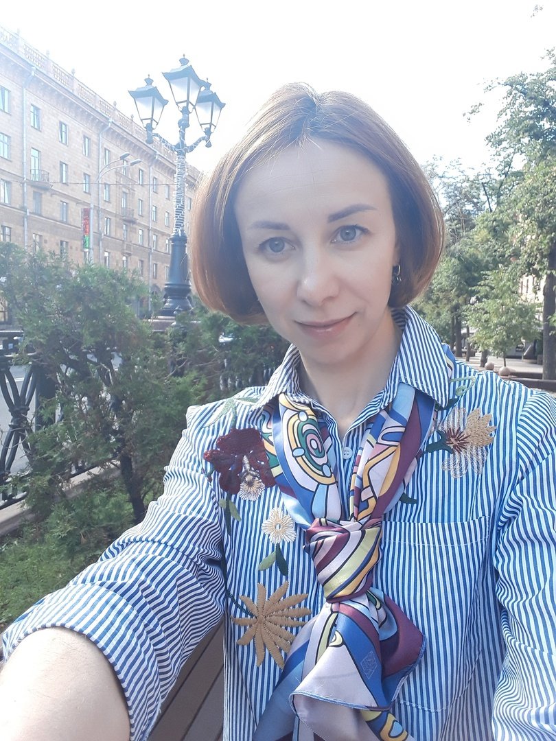 Мариночка, а вам прекрасно в Солнечном городе! Очень красиво смотрится с полоской, и вам очень идёт! А как точно цвет аппликации на блузке совпал с цветом каймы на платке!