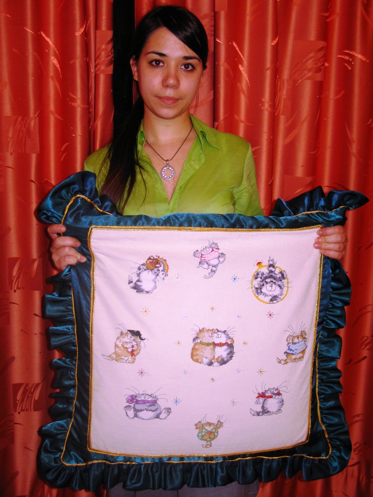 Varezhka, ipsilon1, спасибо. Соблазнов так много, что у меня трех жизней не хватит на воплощение всех задумок. Кошки эти от французской фирмы, называется сюжет "Кошачий хор", хотя мне как раз кажется, что эти создания тихо на Луну любуются. Подушку не жалко, я их делала штук 10 разных специально для кого-то, поэтому осталось чувство удовлетворения, что сделала людям приятное. Себе... Ну ещё сделаю. Дочка платки не любит. Я эту Отраду только что получила, мне она очень-очень нравится, а на неё прямо сейчас стала надевать, а ей всё равно не нравится. Хотя палантины носит, и шелковый платочек Солнечный город красный сразу уцепила. Вот, попросила белый палантин. Заказала, жду. Получим - постараемся показать.