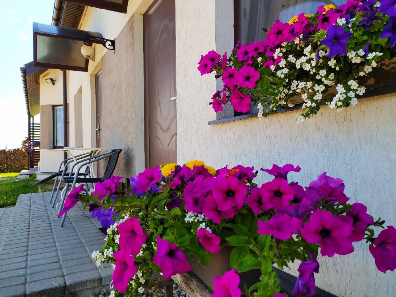 А так я придумала себе выход,как и цветочками хоть немного любоваться, и хлопоты минимизировать. Купила длинные кашпо в тон дома и каждую весну придумываю цветовую схему и набор однолетников( в основном), так ,чтобы они выглядели хоть немножко более цельно и "неслучайно". Из-за того,что двор большой, только очень яркие оттенки в моих гаммах прижились. Более пастельные у нас "не читаются", растворяет их дом и двор.