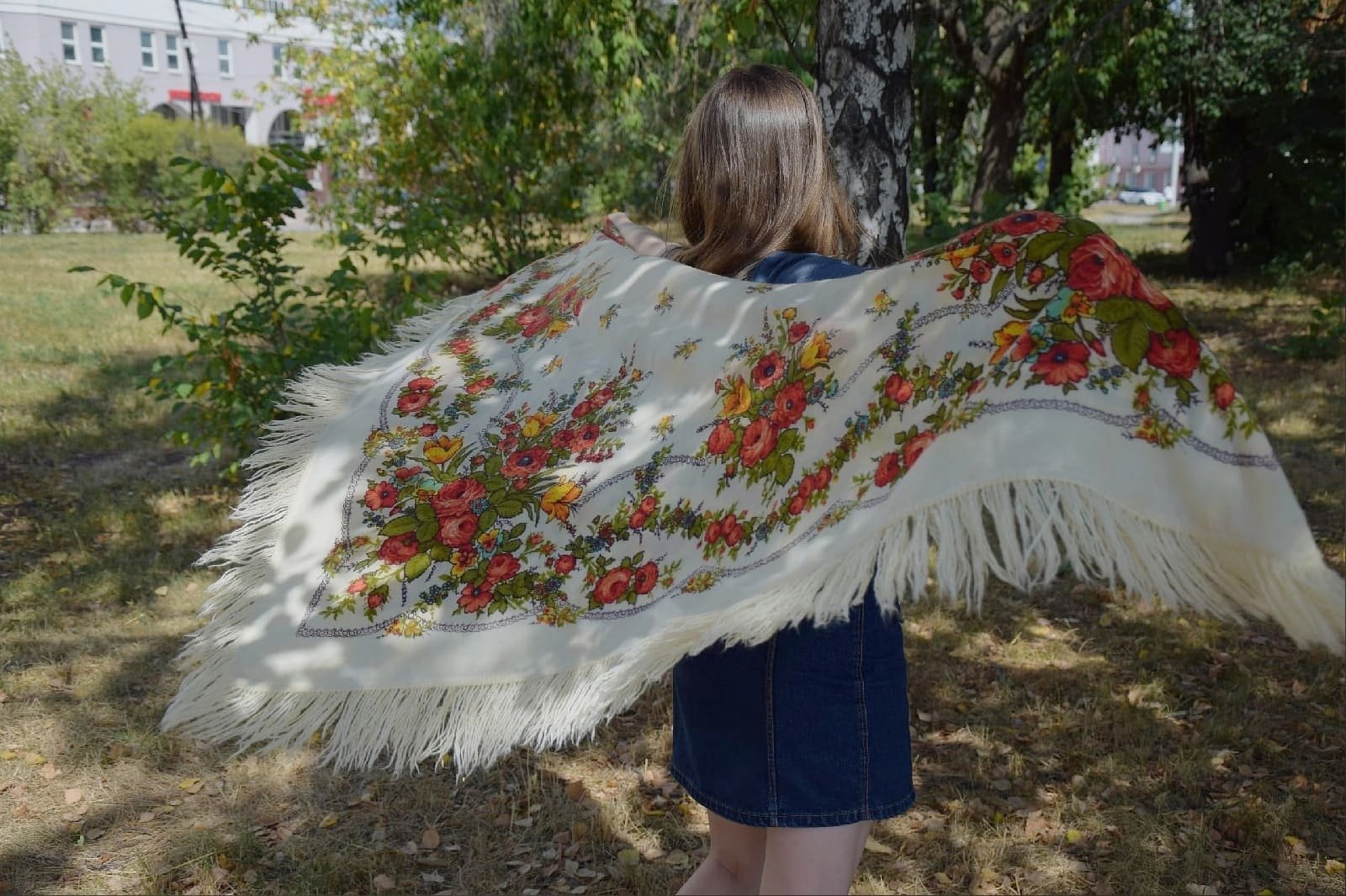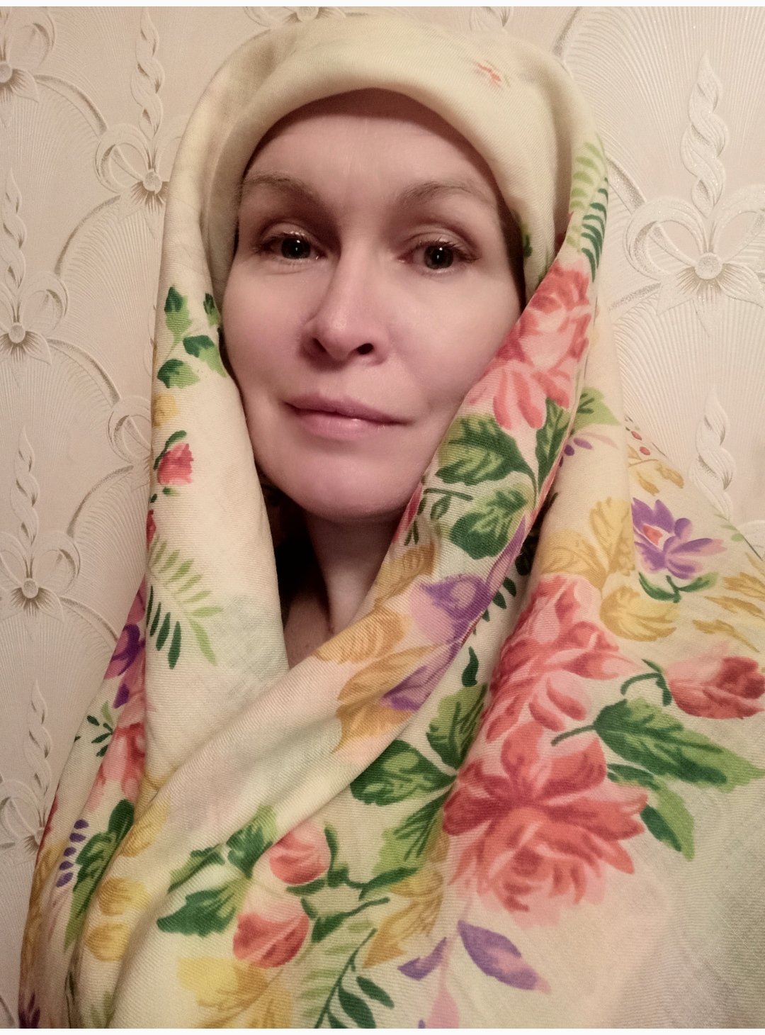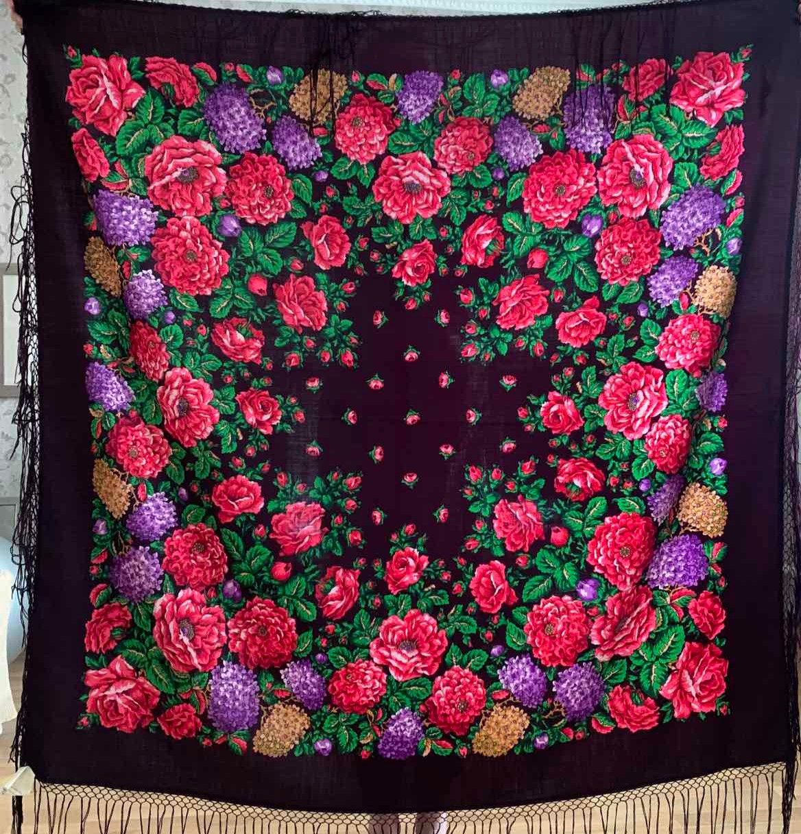 Шаль эффектная - роскошные цветы и выразительная сложная цветовая гамма рисунка. Попыталась с фотографировать, хотя цвет несколько