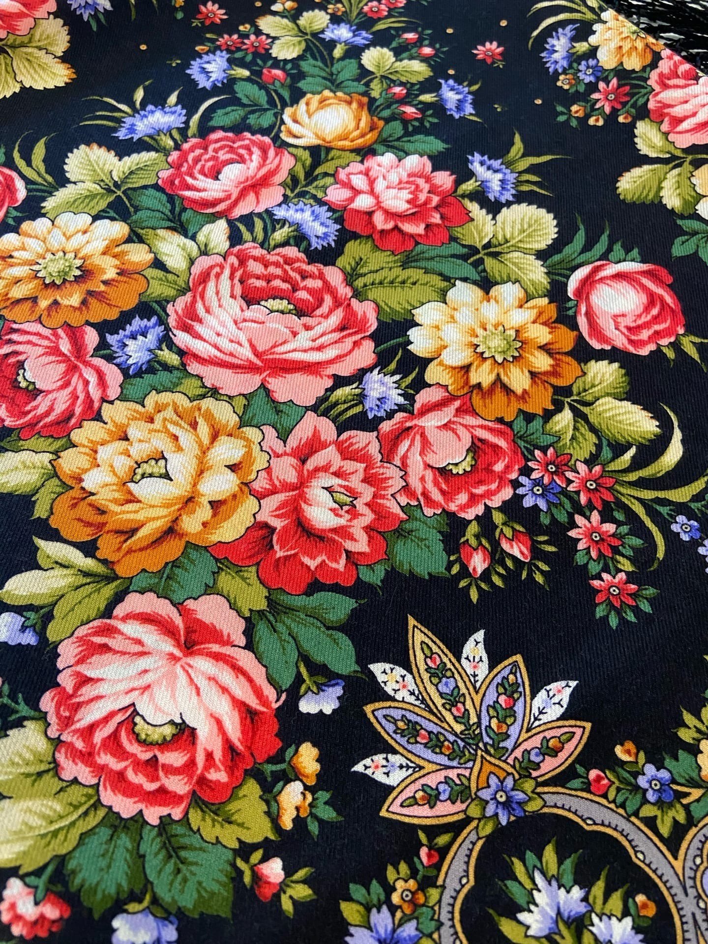 Хочу показать шаль, которую сейчас не так часто показывают, именно в этом цвете. Славянка, вид 18, классика на черном фоне. Люблю букеты на ней, но так и не придумала, как и с чем носить. Полагаю, все еще впереди. Поделюсь этими фотографиями: