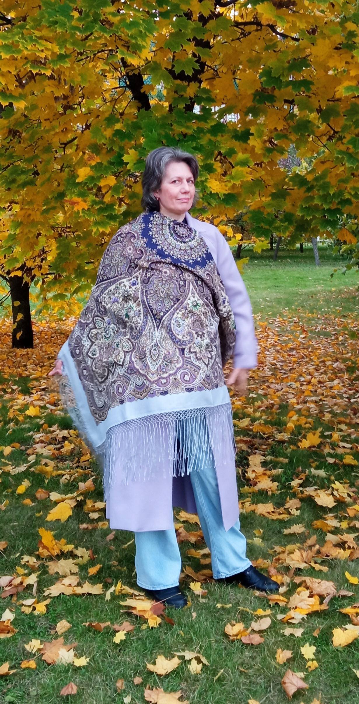 Сиреневое пальто, отличный предмет базы для огромного количества платков, Марина, супер!