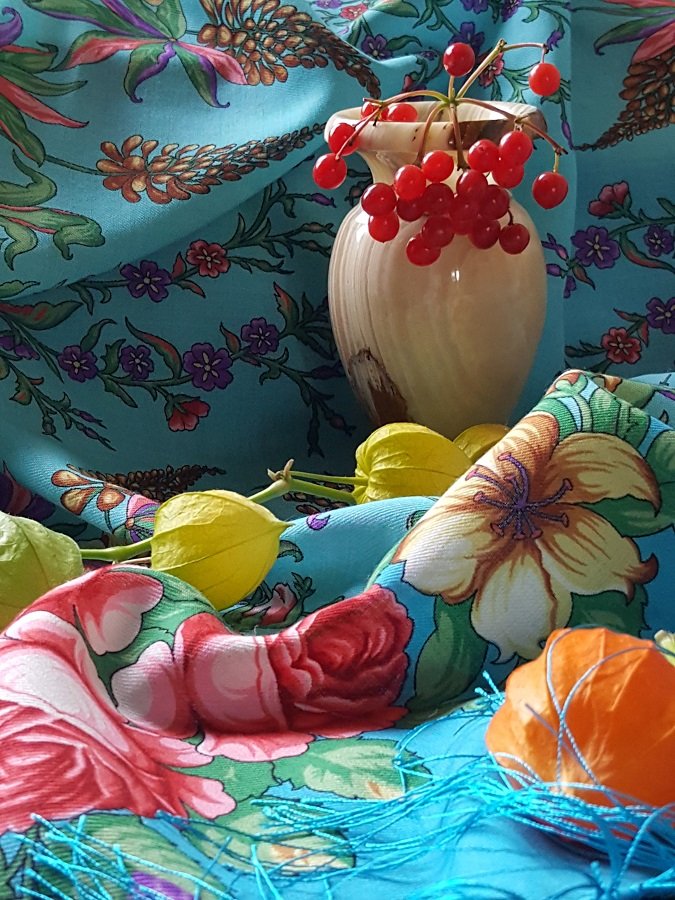 Долго я присматривалась к этому платку, уговаривала себя, что можно обойтись. Не поддалась на уговоры. Назначила этот колорит осенним