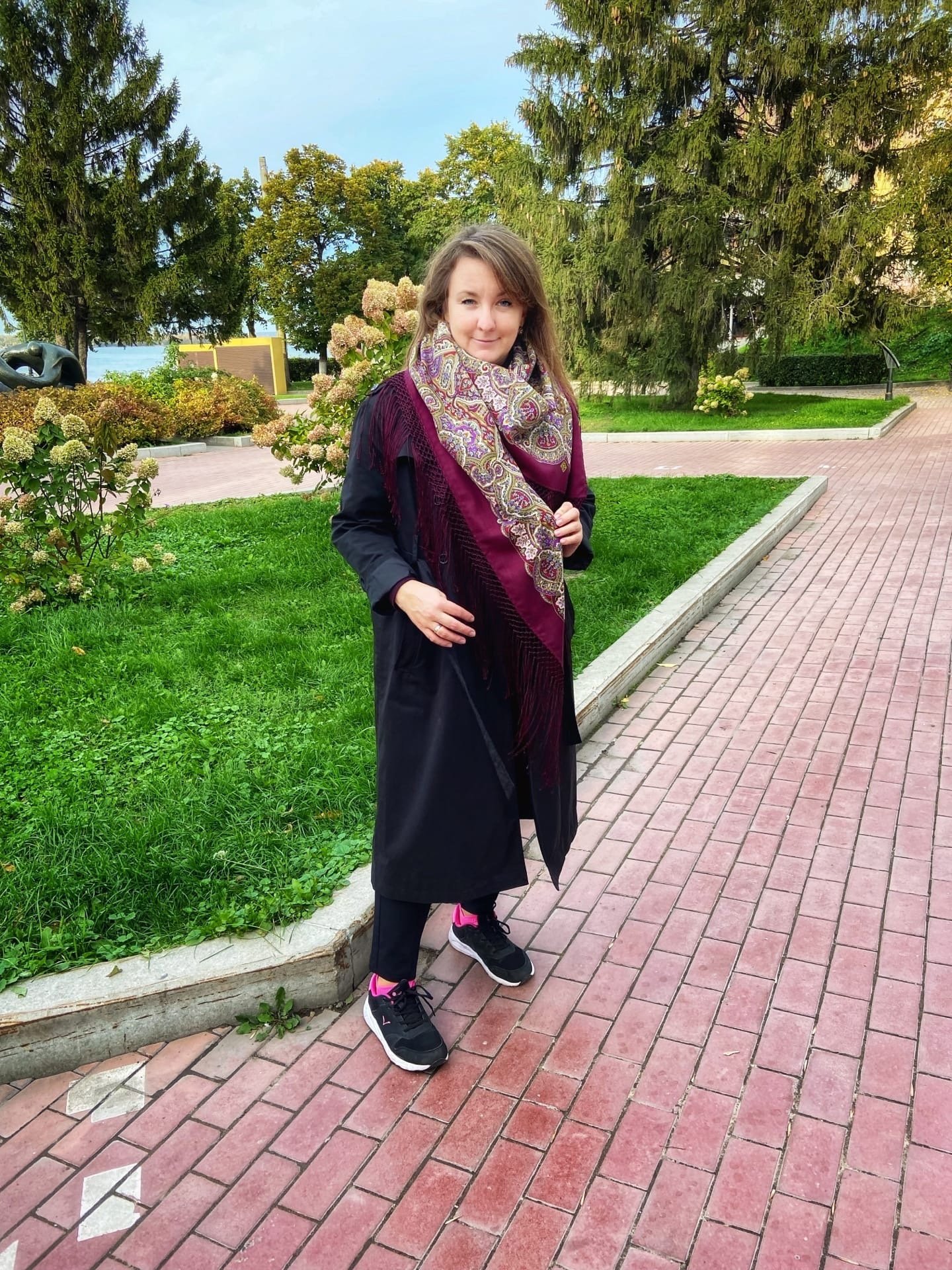 Осеннее настроение подталкивает меня показать немного фотографий прошлой осени, где запечатлен один из моих обожаемых белопольных платков (он единственных из всех, который носится, все остальное является только предметом любования), представленных достаточно скромно на форуме, Утро туманное, вид 1, самый яркий и красочный.