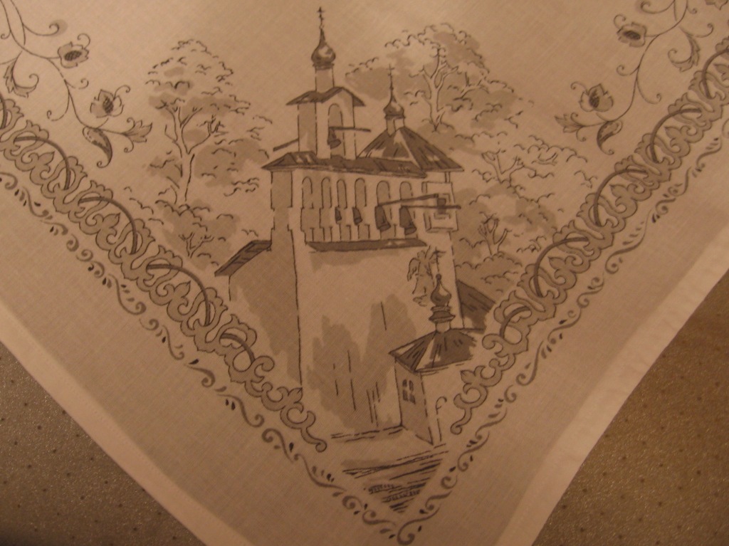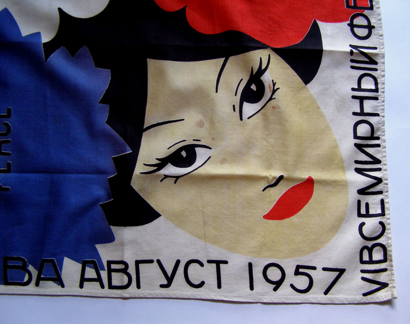 Сфотографировала фрагмент сувенирного платка, который продавался во время фестиваля молодёжи и студентов в 1957 году. Представляете, какой раритет! 8-) Ткань хлопок репсового переплетения. Для дизайна прошлого века рисунок вполне современен и сейчас. Три цвета нашего нынешнего флага.