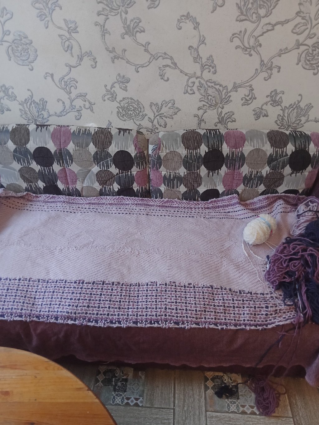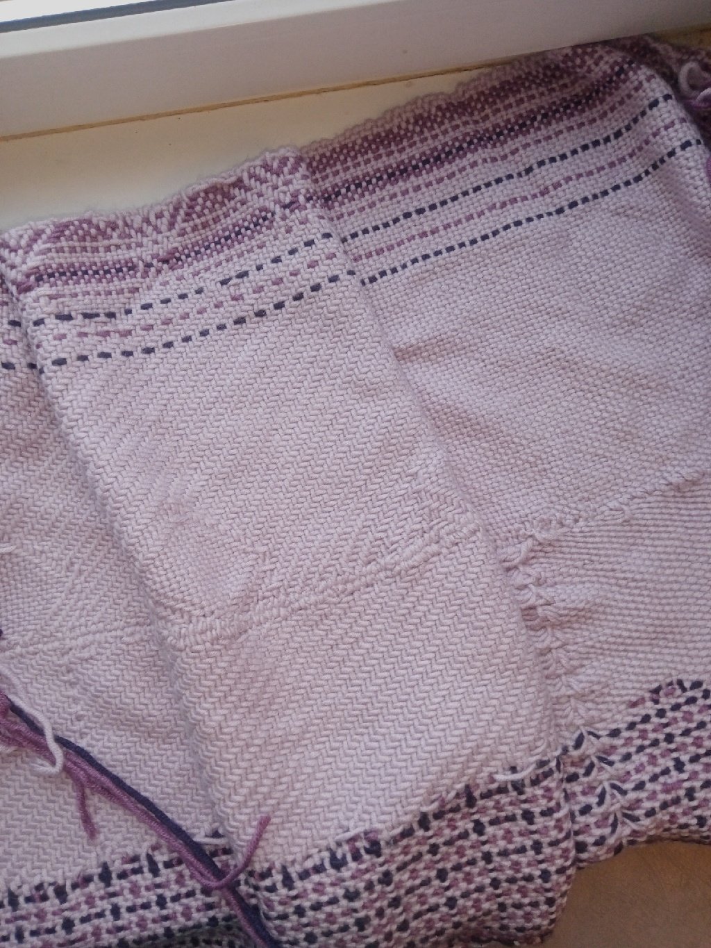 А это ошибочный вариант. Придумала сложный узор, с меняющимся переплетением (сатиновое и полотняное), запуталась, шов получился виден и т.п. Ширина одной половины (т.е.ткань из толстых ниток на всю ширину берда) получилась 33см. Т.е.готовое изделие получается Уже берда, в любом случае.