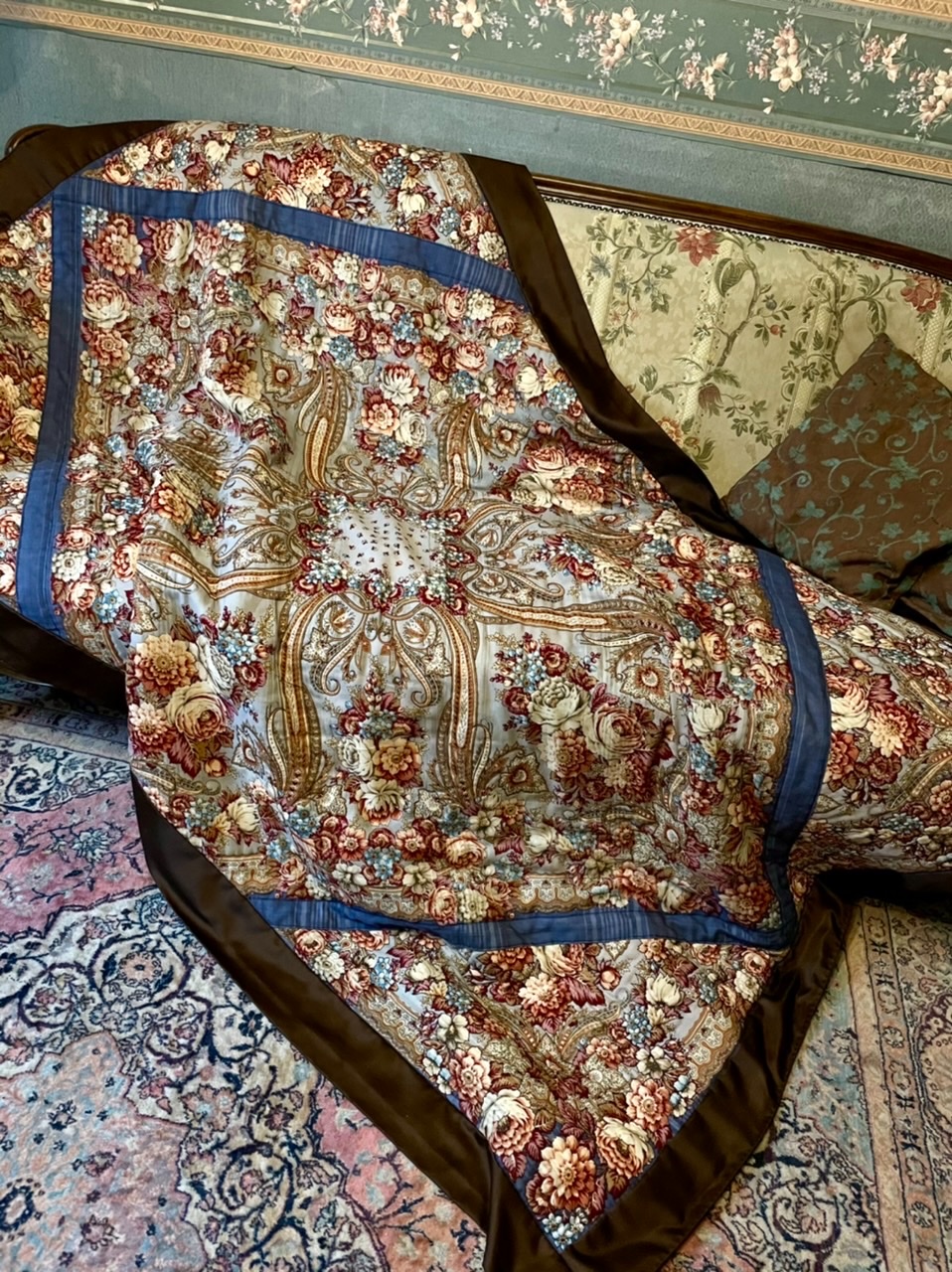 Шаль Именинница-2 превратилась в покрывало. Пару лет назад решила сотворить такую радость. Две шали были уложены на новозеландскую шерсть и вручную простёганы шелком. Обшивала каждый крупный цветок, букет и вензель. Стежки около 2 мм. Серединки у крупных цветов вышиты бронзовым бисером. Подклад и кайма из вискозы шоколадного цвета. Шёлк для простёжки выбирала в цвет каймы. Получилось очень тёплое и воздушное покрывало