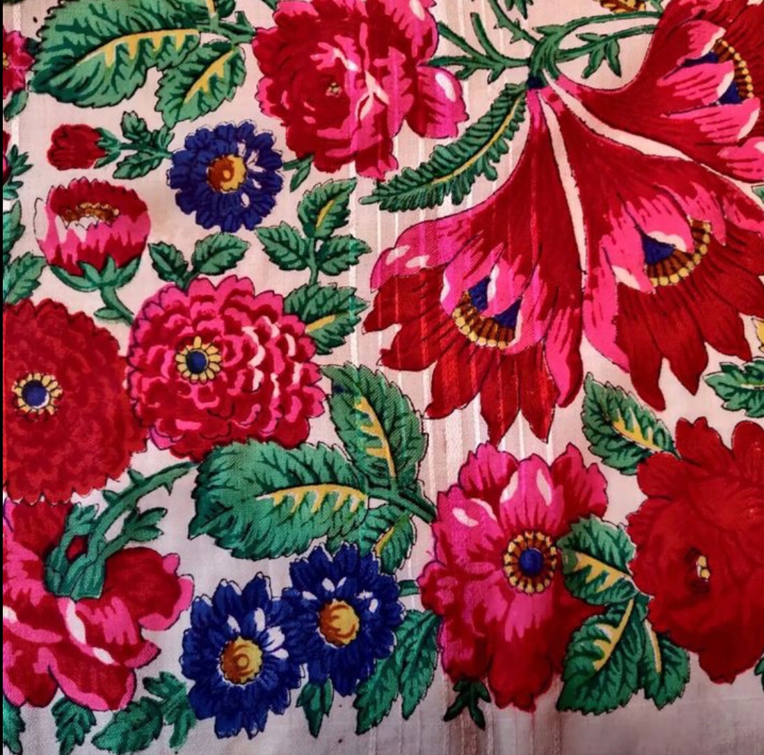 Как я понимаю, Валерия Фадеева нарисовала крок по мотивам старинной шали, доработав его, средник оставив без штампочек, чтобы Виктор Зубрицкий мог нарисовать вручную портрет Репина. Напечатали небольшую партию, и портрет скорее всего был нарисован на одном платке?