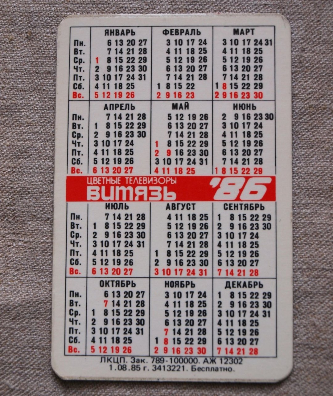 Карманный календарик за 1986 год с рекламой цветных телевизоров Витязь. Такое уютное фото с самоварами (будто это их рекламируют)