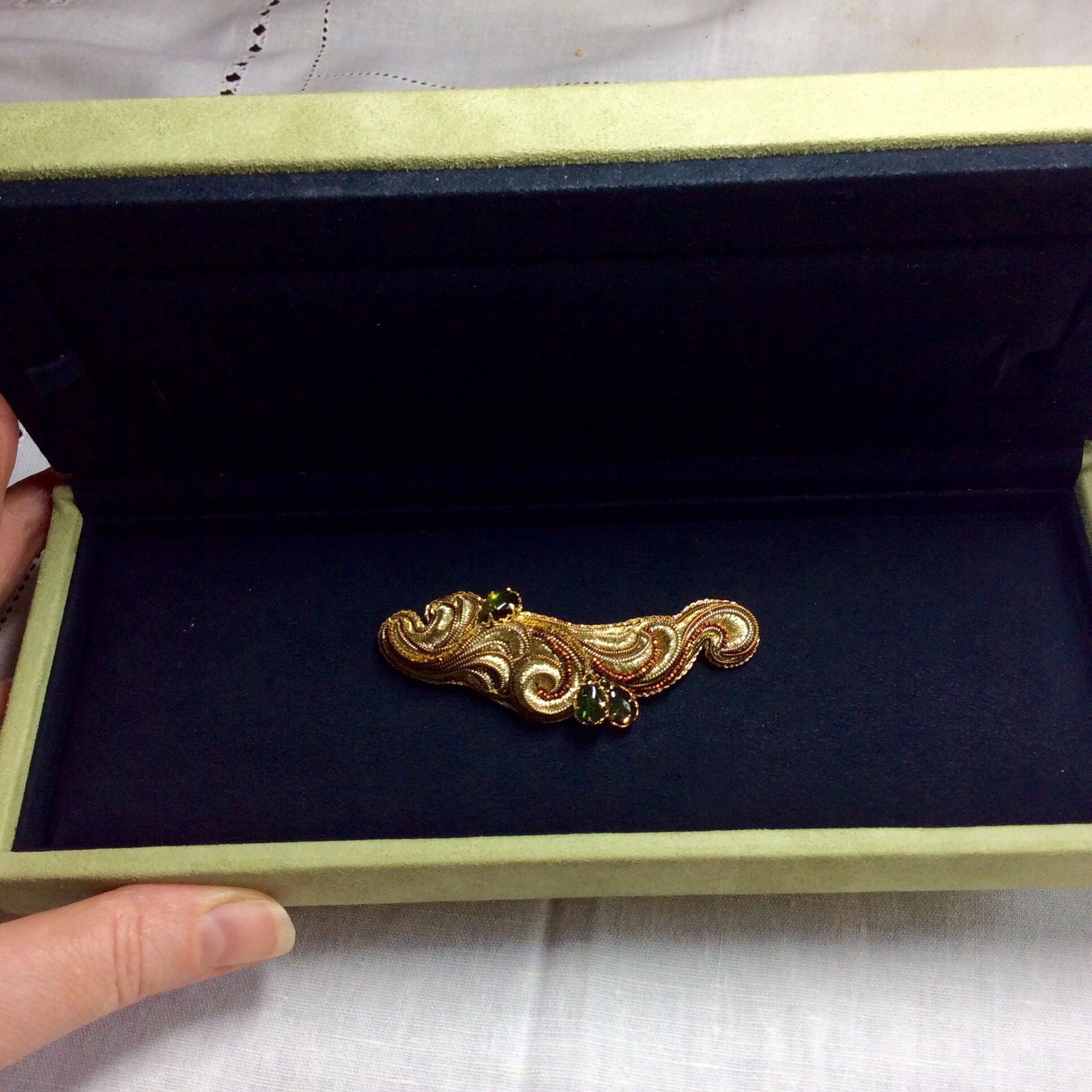 Обычно, когда говорят о золотном шитьё, то сразу всплывают в памяти мундиры, церковное облачение, покрова и оклады. Но и в светской жизни эта вышивка была востребована: для барышень расшивали золотом потрясающие шали(драгоценный плат), кокошники, повойники, душегреи, сумочки, сапожки и прочие атрибуты дамской красоты. Это мы ещё не говорим про царский двор! Мастерицы, которые владели этими техниками, ценились на вес золота. Если крепостную продавали легко, то златошвейка была тем последним товаром, который могли продать, причём за огромную сумму. Техники работы с драгоценными нитями кропотливые и не все хотят ими заморачиваться. Современные мастера всё больше отходят от клерикальной темы и уходят в светское шитьё. Можно работать в ювелирных малых формах. Я работаю с высоким настилом и изделие получается по ощущениям практически «литым». В этой технике и создана эта небольшая брошь. Размер 7,5х2 см. В работе использованы антикварные золотые нити с высоким содержанием золота, антикварный микробисер (стальной и стекло 0,8 мм), канитель и капли турмалина.