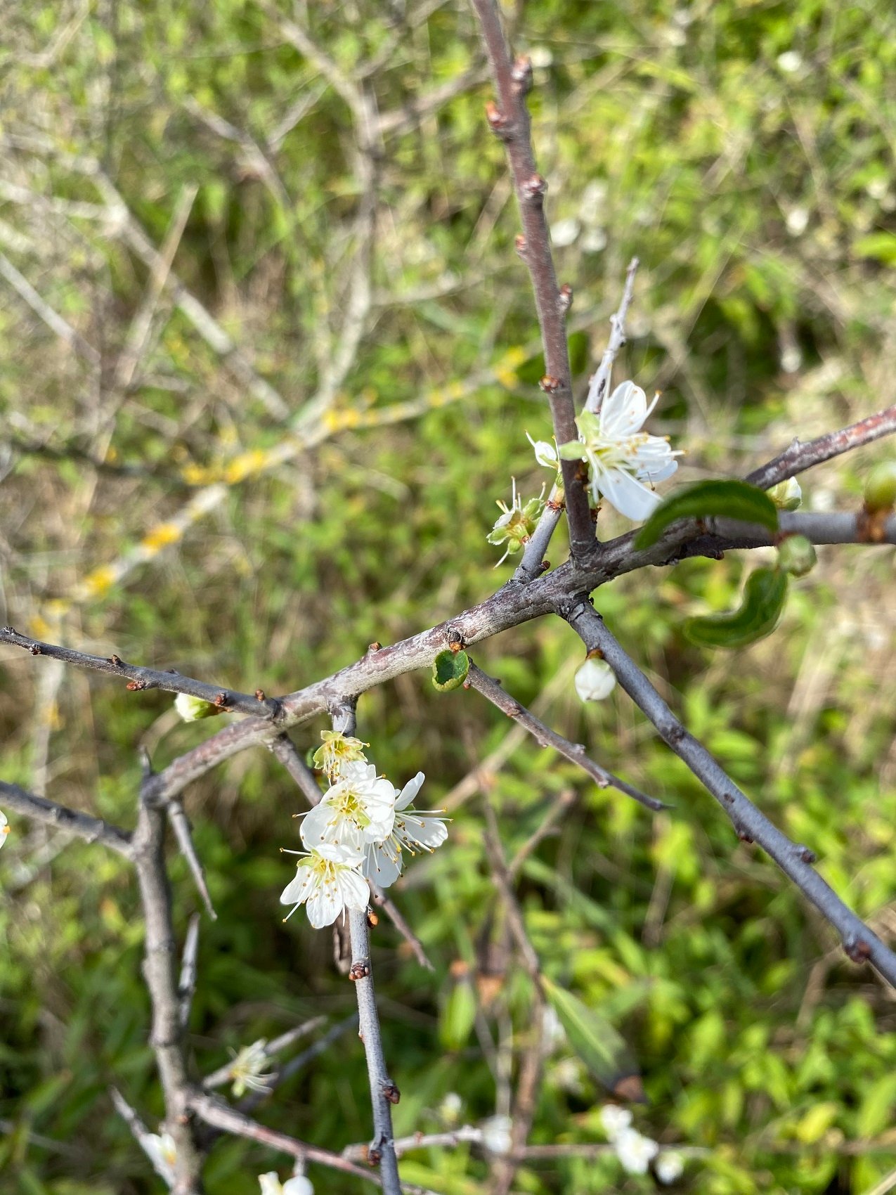 На морском берегу среди зарослей усыпанной оранжевыми ягодами дикой облепихи встретились цветущие кусты, явно что-то плодово-ягодное. Я бы сказала, что это терновник, который цветет вообще-то в апреле-мае.