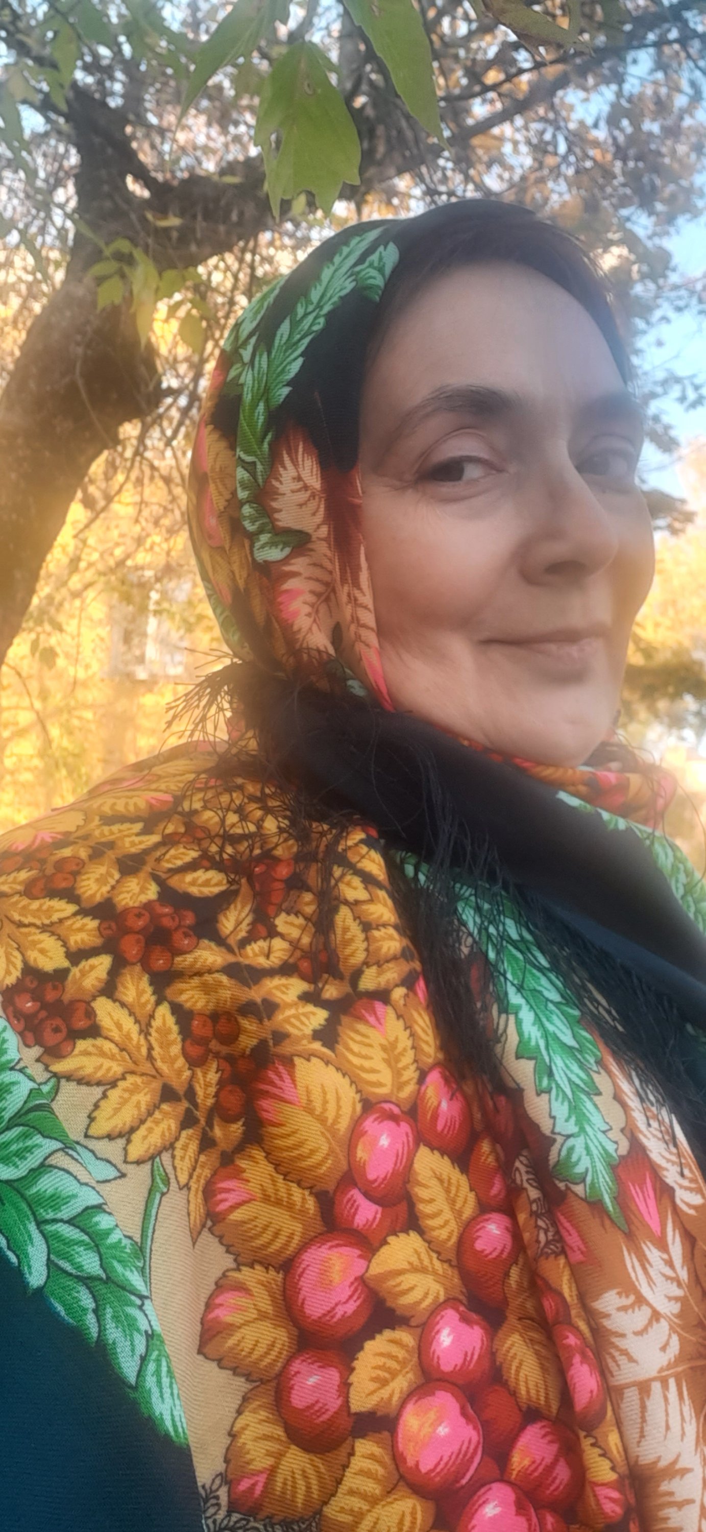 Месяц назад купила День осени златой 14 колорит. Самый яркий из всех осенних! Платок дивный! Спасибо Виктору Зубрицкому. Шаль прекрасно смотрится на голове и подходит для интерьерной драпировки. Добавляла шаль в оформление школьной фотозоны. Теперь ученики пишут декоративный натюрморт.