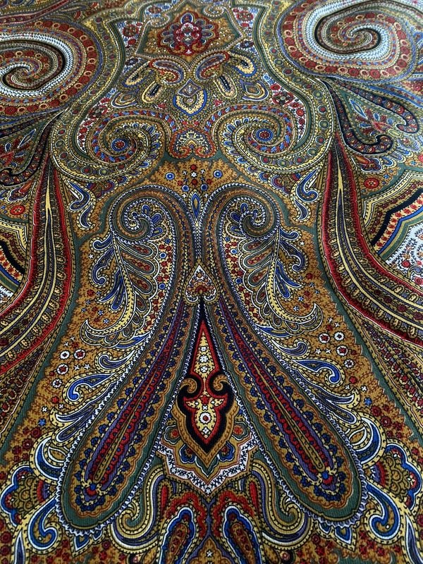 Мне экземпляр пришел густого , темноватого колорита. Показалось даже, что цвет каймы близок к модному цвету года 2023--маджента, карминовый. Иногда, при ярком освещении этот красный вспыхивает теплым огоньком, но остается таким же насыщенным. Ткань тонкая, гладкая. Качество хорошее. Изготовлен 14.11. 2022.