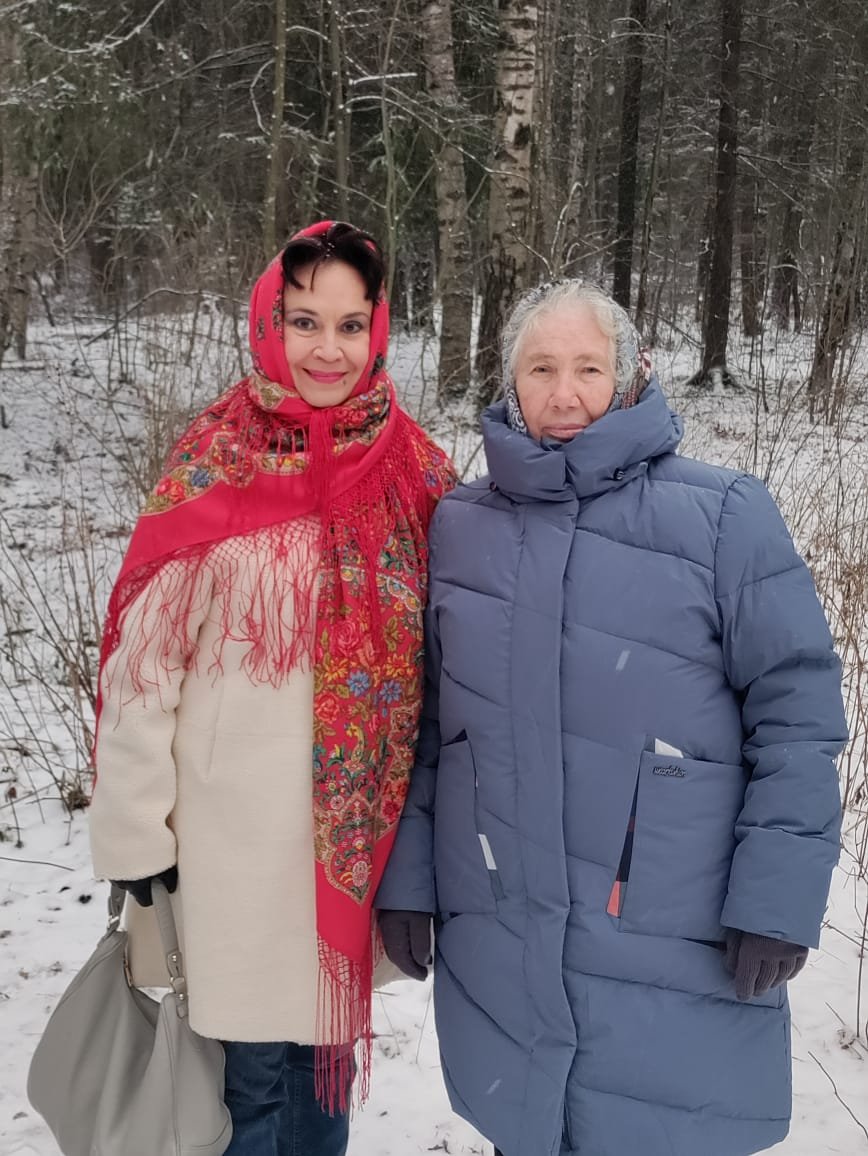 Дорогая Флеринка _Наташенька, не могу не задержаться на таких душевных фотографиях. Очень вам к лицу выбранные платки. Медальоны подчёркивают твою молодость, красоту, подсвечивает прекрасное лицо. А Бархатная ночь очень благородно обрамило свекровушку. Очень вам обем идут платки. Любуюсь!