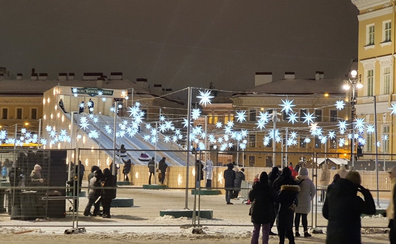Позади горки Певческий мост. Кто докатится до Столпа - тому приз: повторное катание вместе с Александром Дмитриевичем Бегловым (шутка, никто не докатится).