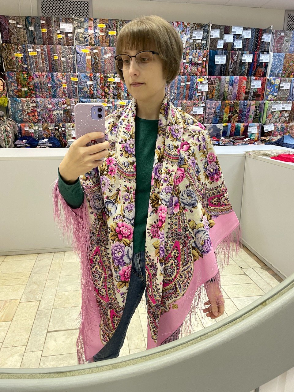 Платки на витринах висят, как известно, компактно, и кайму не видно, разве что за исключением нижнего ряда. Когда кайму мне показала продавец я только и сказала "вот это да". Руки сразу потянулись, сердце забилось чаще. Много ли розовых платков у Мануфактуры? "А много ли их у меня?" - рассуждала я во время примерки.