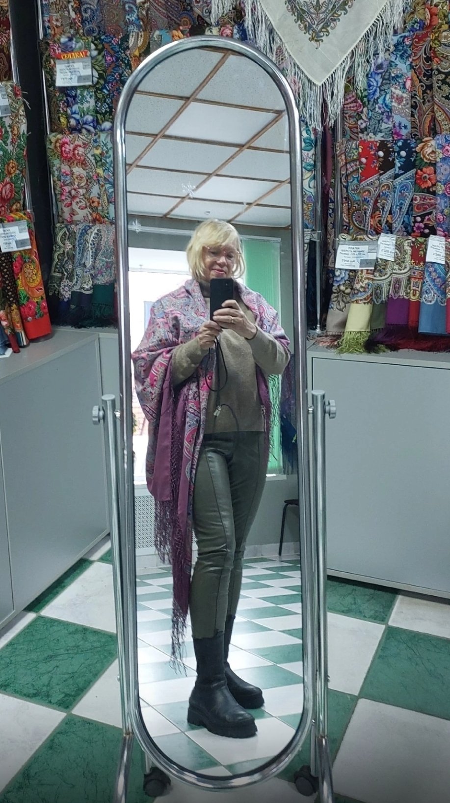 Как оказалось - шаль Подмосковье в 3 колорите имеет разные варианты печати, у меня яркой печати, Оксана в другой ветке показала Подмосковье с каймой цвета пыльной розы, очень интересный колорит, даже захотелось примерить, может в Москве есть ещё такие шали, надо поискать.
