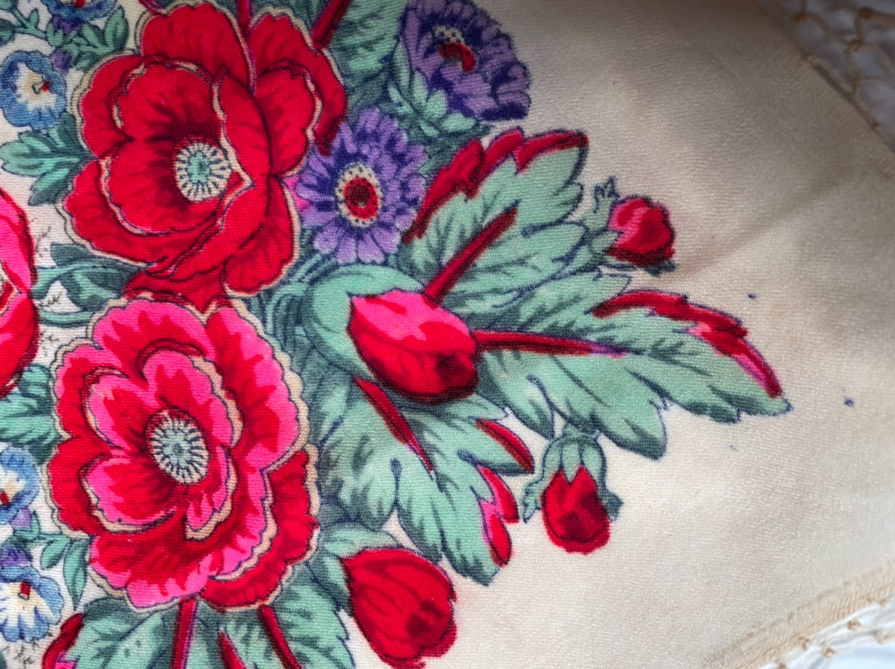 Не перестаю восхищаться прелестью ручной набойки и удивительными оттенками, которые художники выбирали при создании шали. Обязательно смотрим на изнанку и сравнение бахромы. Шаль подшита шёлком с двух сторон, две другие - производственная кайма. Зато легко можно найти долевую))), а я постараюсь придать бахроме должный вид