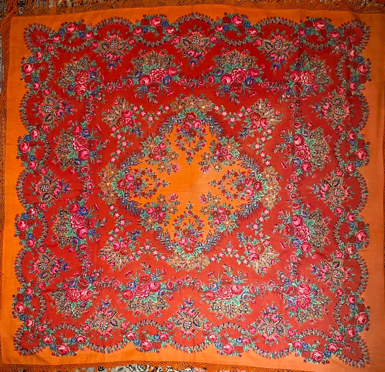Привезла вчера шаль и весь вечер любовалась. Антикварный ППД_11, конец XIX - начало XX века в цветовом решении, которое у нас в архиве не было ещё представлено. Кайма и средник оранжевые, рисунок по красному полю. Размер 153х160. Смесовая (хлопчатобумажная основа и шерстяной уток), шерстяная бахрома целая. Из фабричной маркировки только цифровой штамп «247».