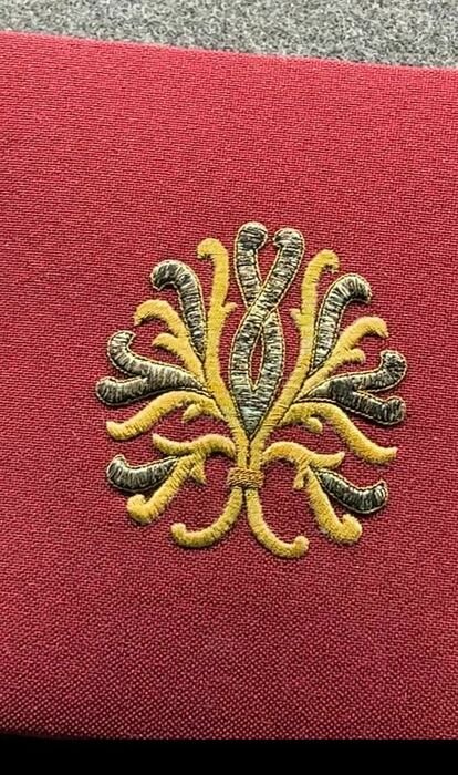 Для создания такой вышивки золотошвейки использовали специальную деревянную катушку – витейку. Благодаря равномерной намотке нитей на инструмент, они не соприкасались с руками, тем самым не путались и не окислялись. Данный инструмент в золотном шитье используют по сей день. На фото не очень видно- интересно ,когда на вышивке играет свет.
