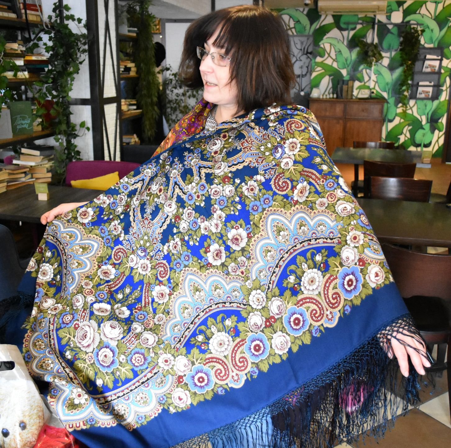 Но какой же красивый оттенок темно-голубого на этом платке!