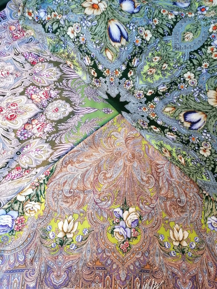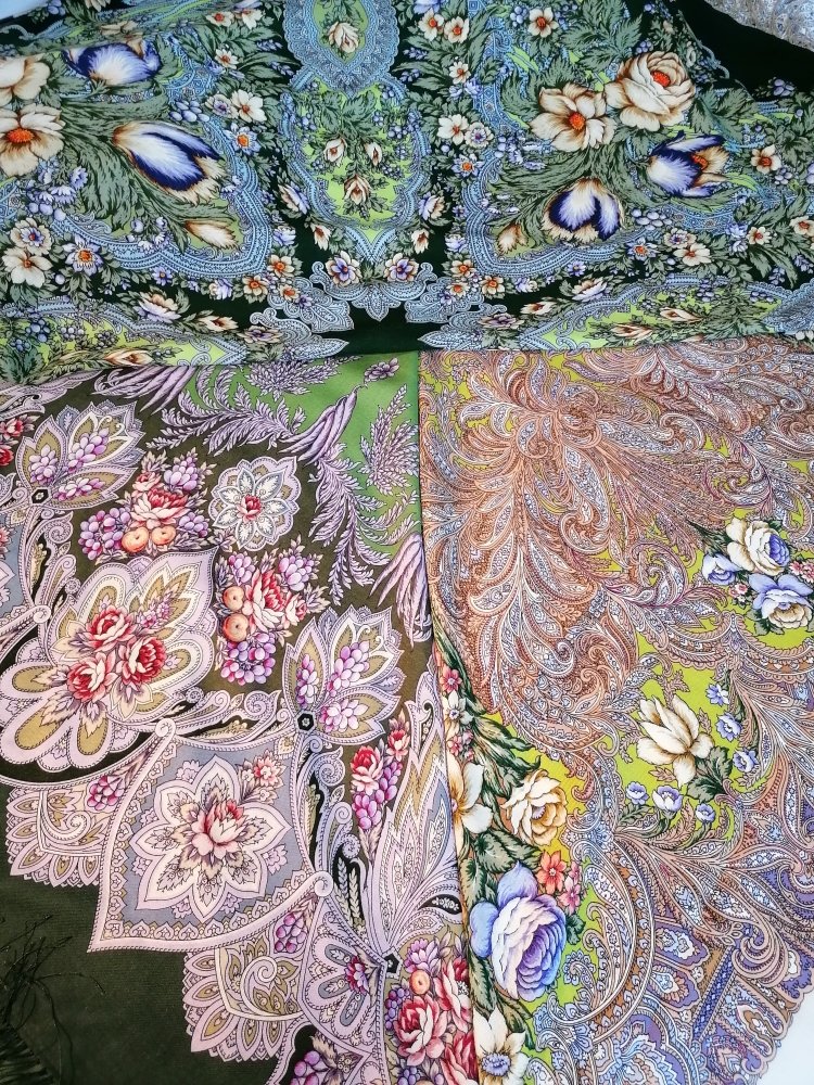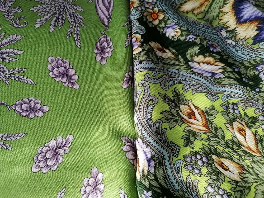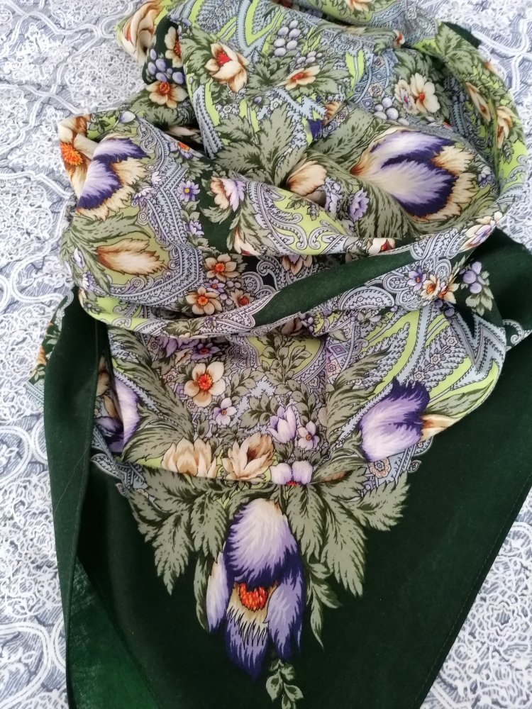 Оба платка нравятся, но совершенно не мои. Иногда правда хочется поплясать с бубном, чтобы надеть эту лесную зелень. Не хватает лимонной Чародейки Зимы в сравнении, все три одного художника. Хороши были бы комплектом