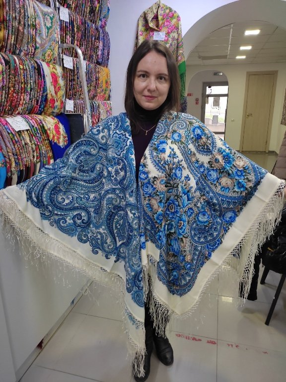 А вот с ней пришлось побороться. Уже и дома она прописалась. Три дня любовалась на вешалке. И все-таки вернула. Техника "цветного риса" не по нутру мне все-таки. Это я о фадеевских платках типа Шиповник, Сны белых цветов, Сказочница, Огонек в ладонях и др.