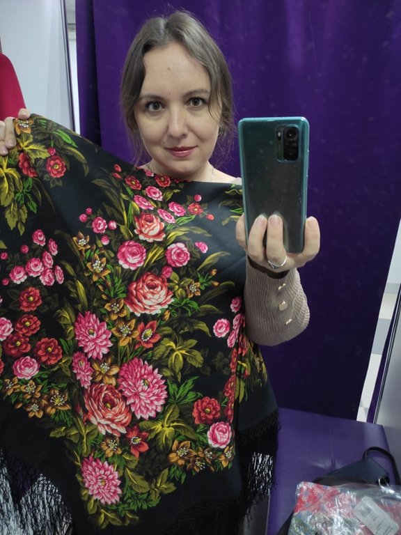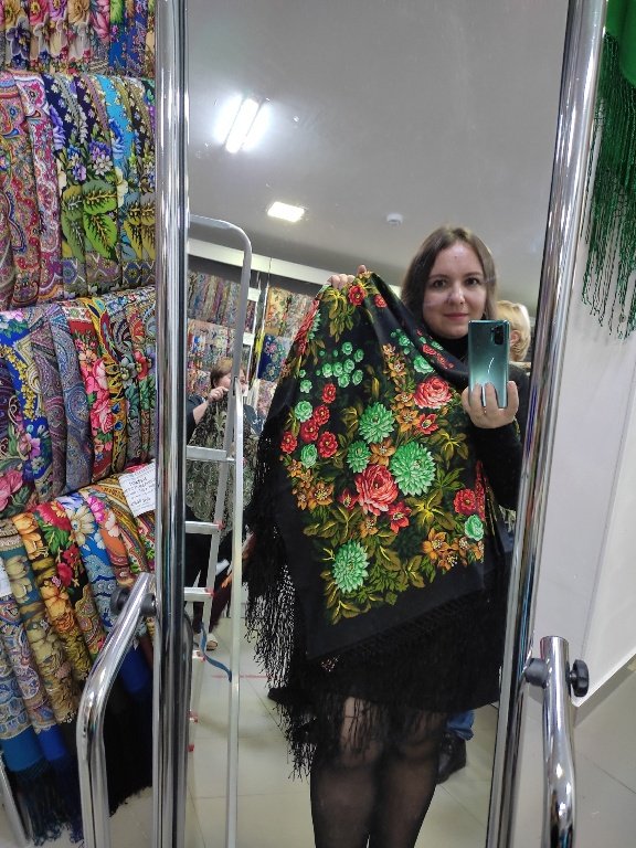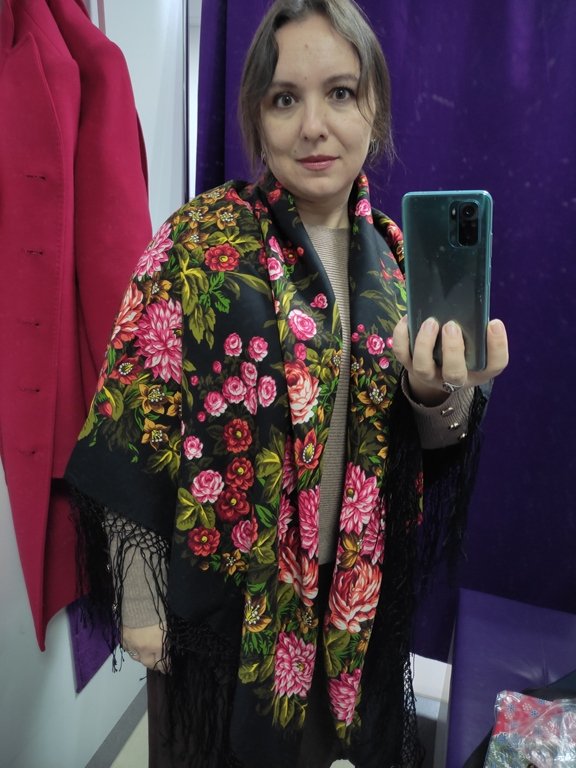 А вот с ней пришлось побороться. Уже и дома она прописалась. Три дня любовалась на вешалке. И все-таки вернула. Техника "цветного риса" не по нутру мне все-таки. Это я о фадеевских платках типа Шиповник, Сны белых цветов, Сказочница, Огонек в ладонях и др.