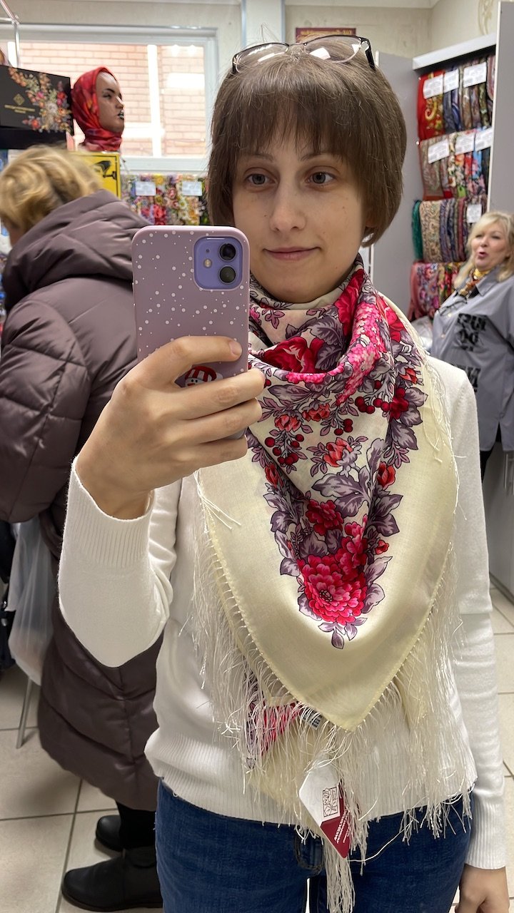 И счастливую меня под конец примерок. А счастье от крупной добычи в три платка.