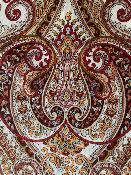 Контрастный, нежный и деликатный рисунок! Опасалась неонового, персикового-желтого. Нет --есть похожий цвет, но он больше "тыквенный сок". Очень прекрасный--красный георгин. Много прожилок с осторожным темно-розовым. Общий фон , как обычно молочно-сливочный.