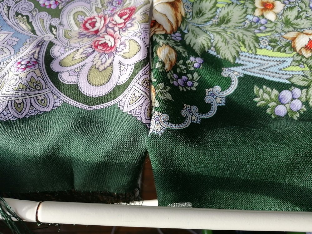 Оба платка нравятся, но совершенно не мои. Иногда правда хочется поплясать с бубном, чтобы надеть эту лесную зелень. Не хватает лимонной Чародейки Зимы в сравнении, все три одного художника. Хороши были бы комплектом ::