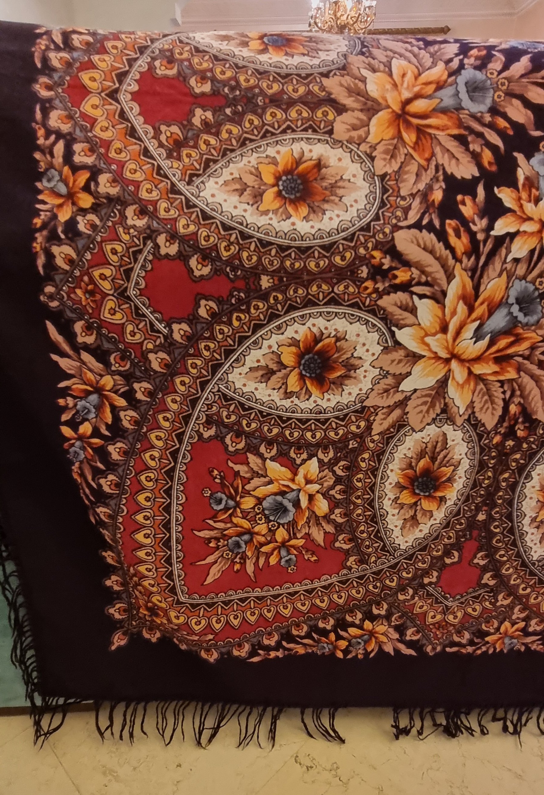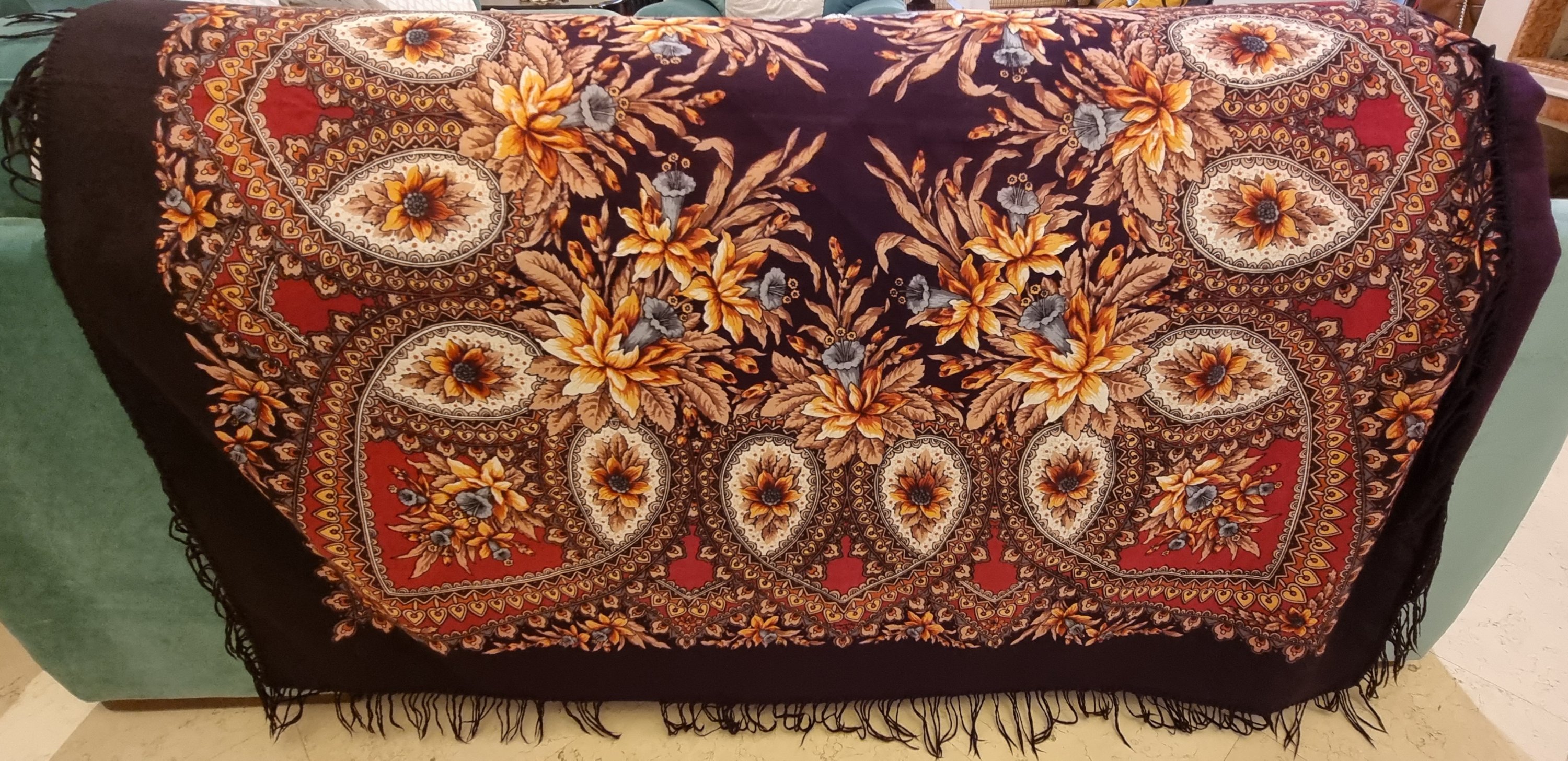 Здравствуйте, уважаемые форумчанки! Однажды вы меня уже выручали. Вот купила с рук ещё один платочек. Совсем не уверена, что он Павловский. Но все же покажу, вдруг кто-то с ним знаком. Спасибо заранее!