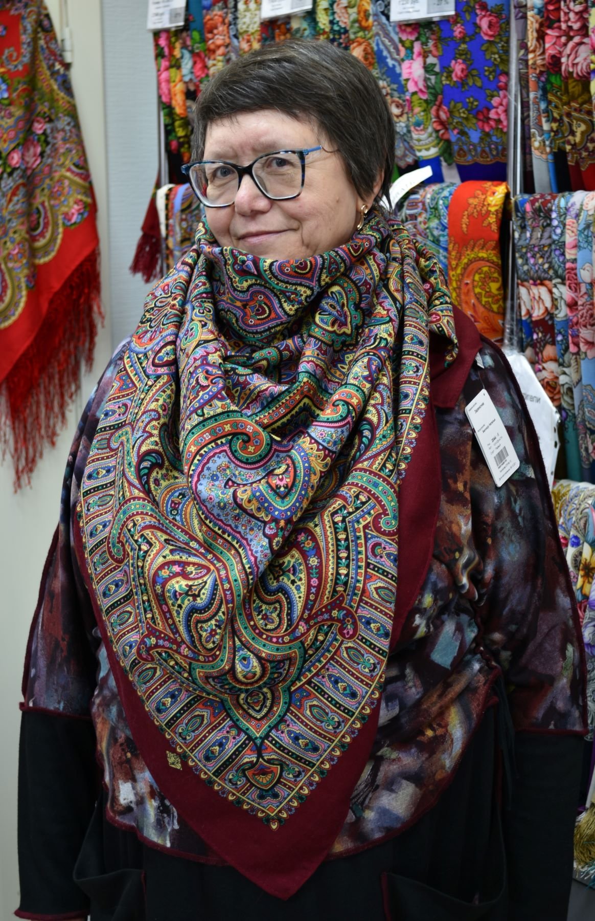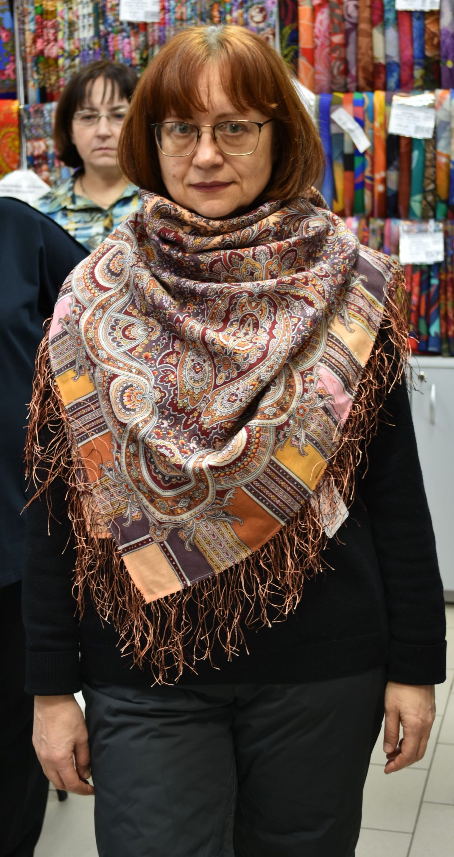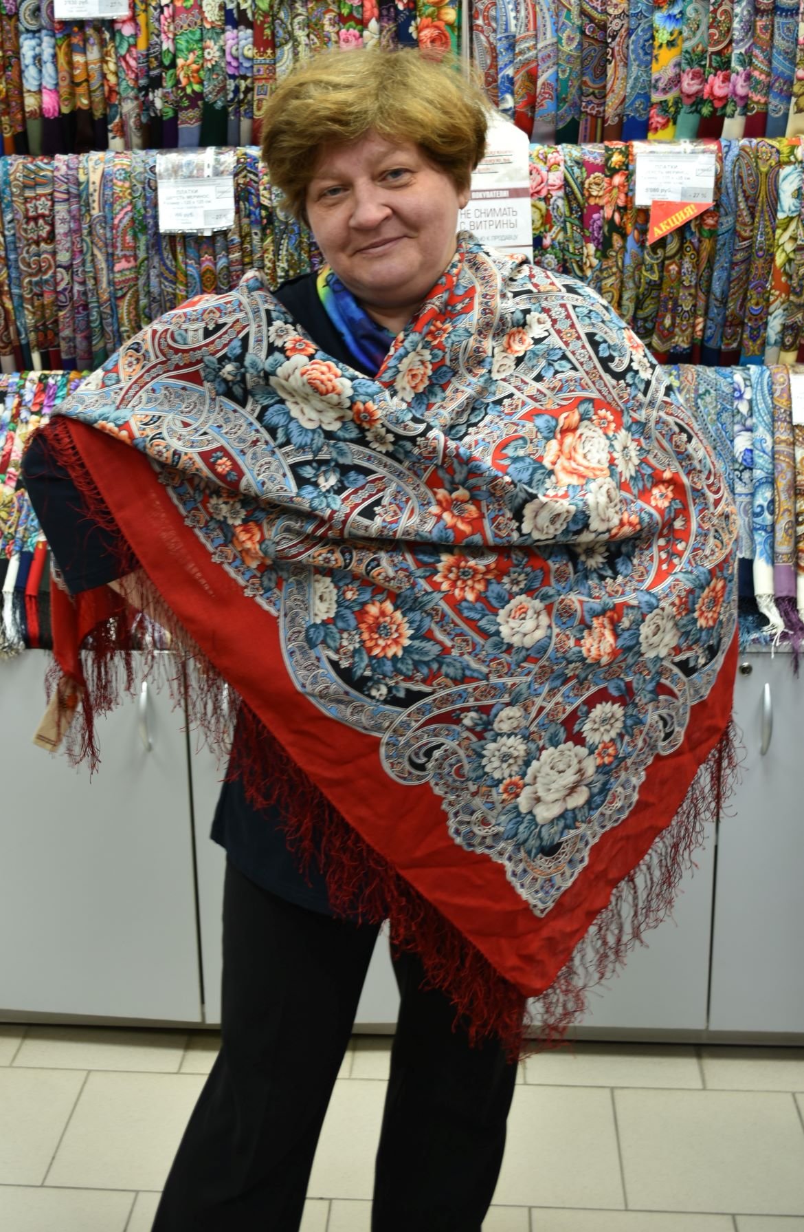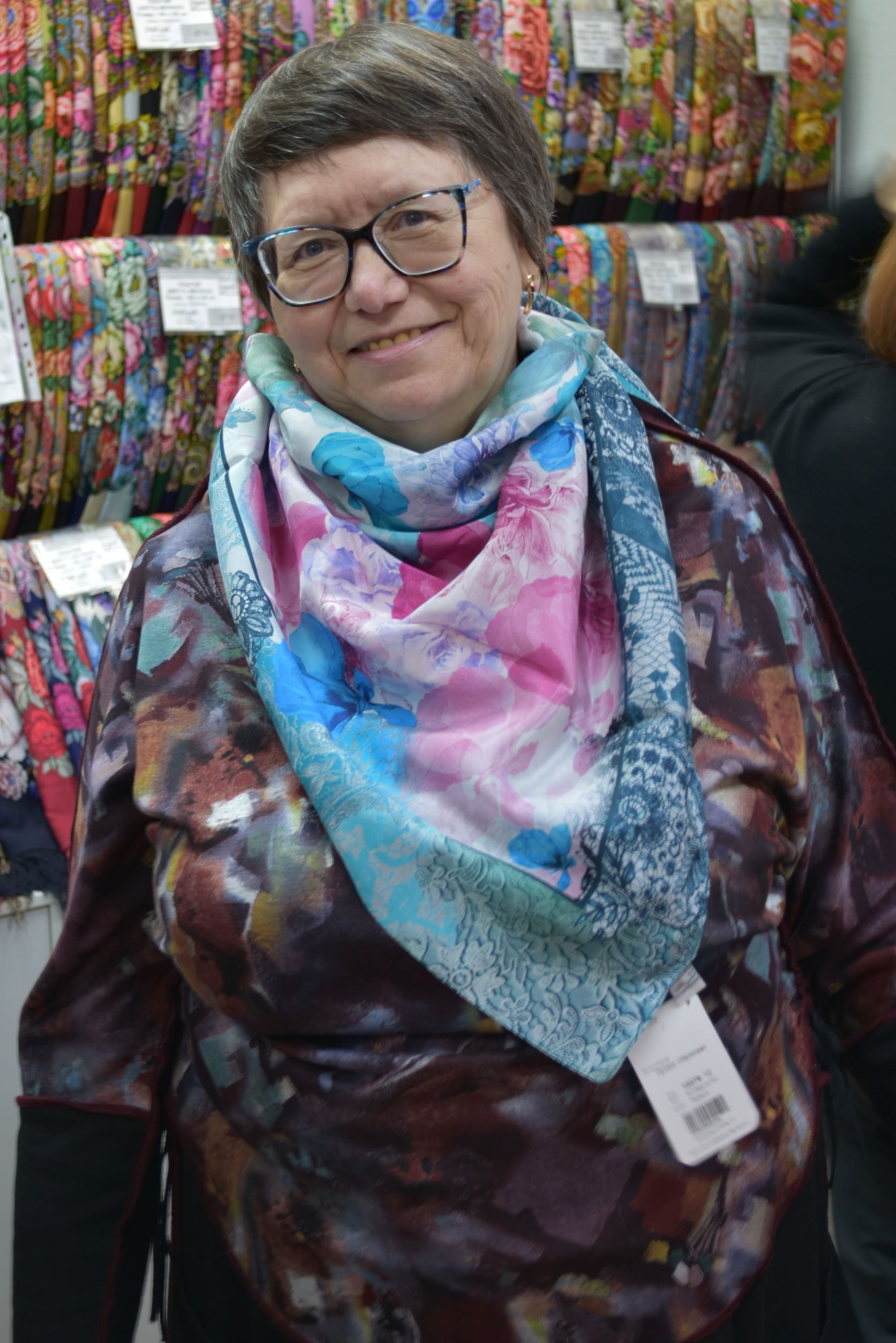 Я воспользовалась тем, что доступ к витрине с шелками освободился, прилипла к ней. Ну люблю я шелк! Примерила 3 крепдешиновых платочка. Названия у них, понятно, не фонтан, но сами платочки красивые.