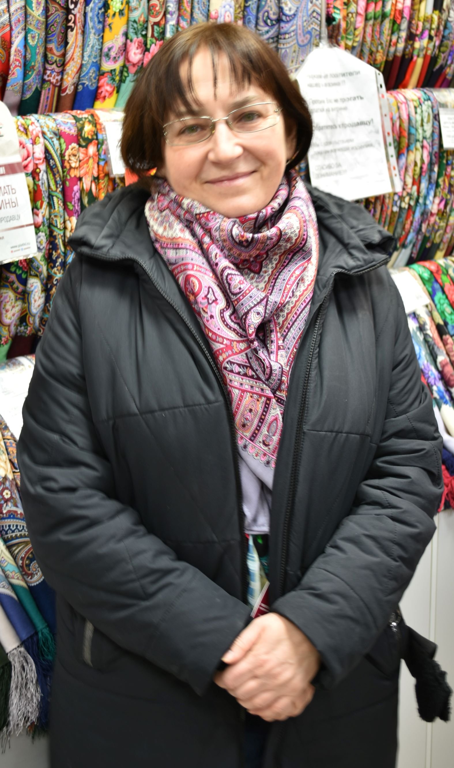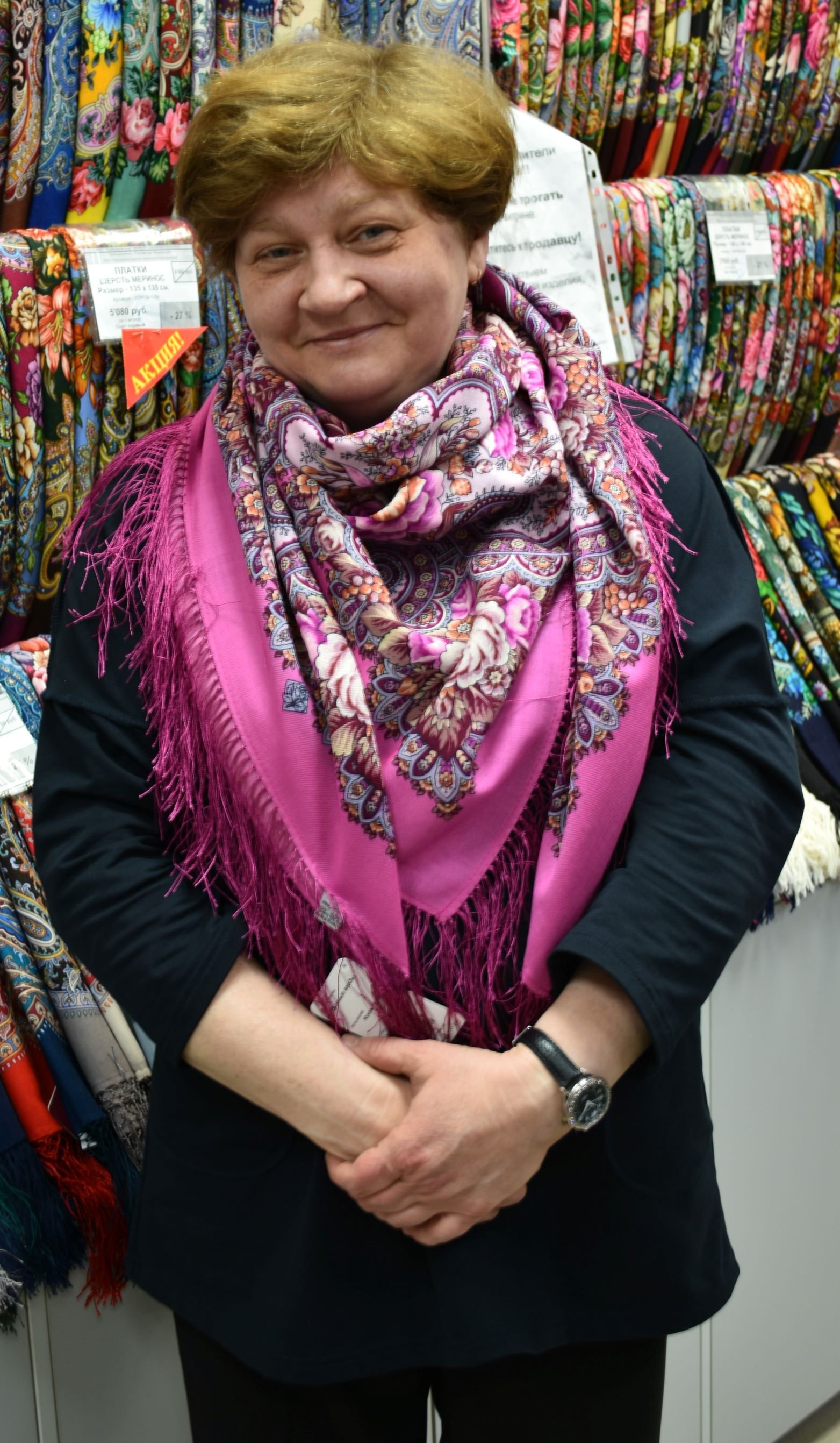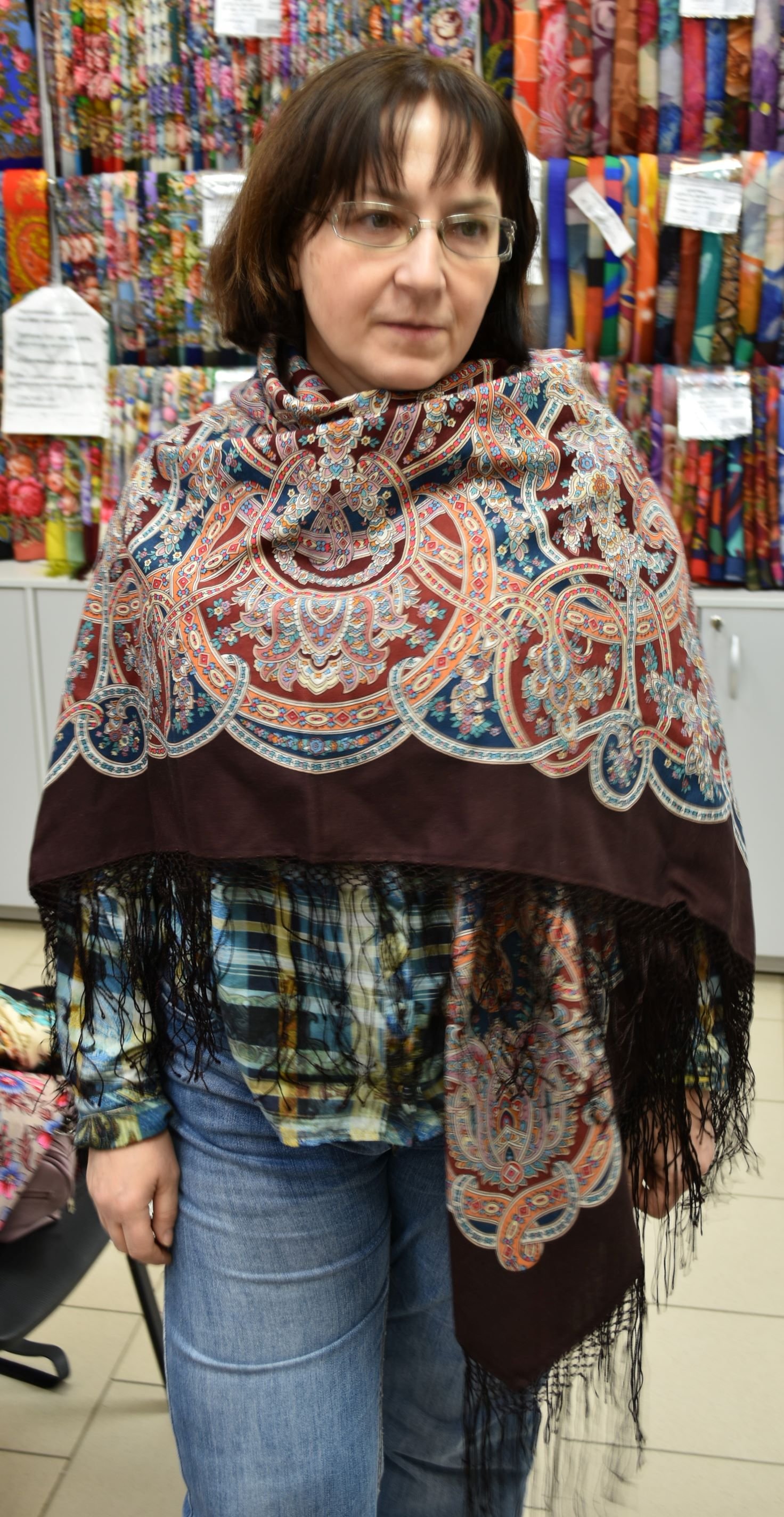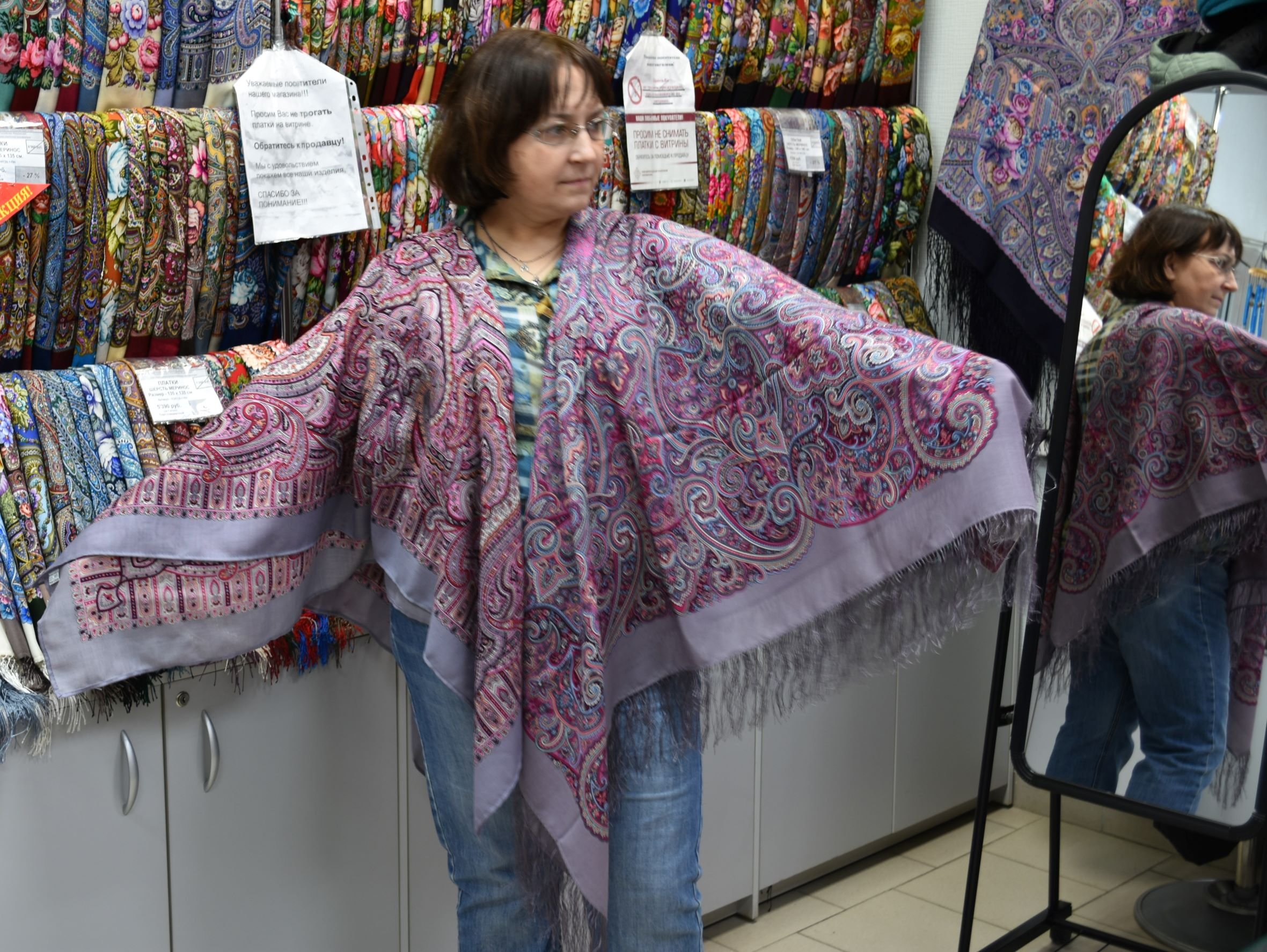 Я воспользовалась тем, что доступ к витрине с шелками освободился, прилипла к ней. Ну люблю я шелк! Примерила 3 крепдешиновых платочка. Названия у них, понятно, не фонтан, но сами платочки красивые.