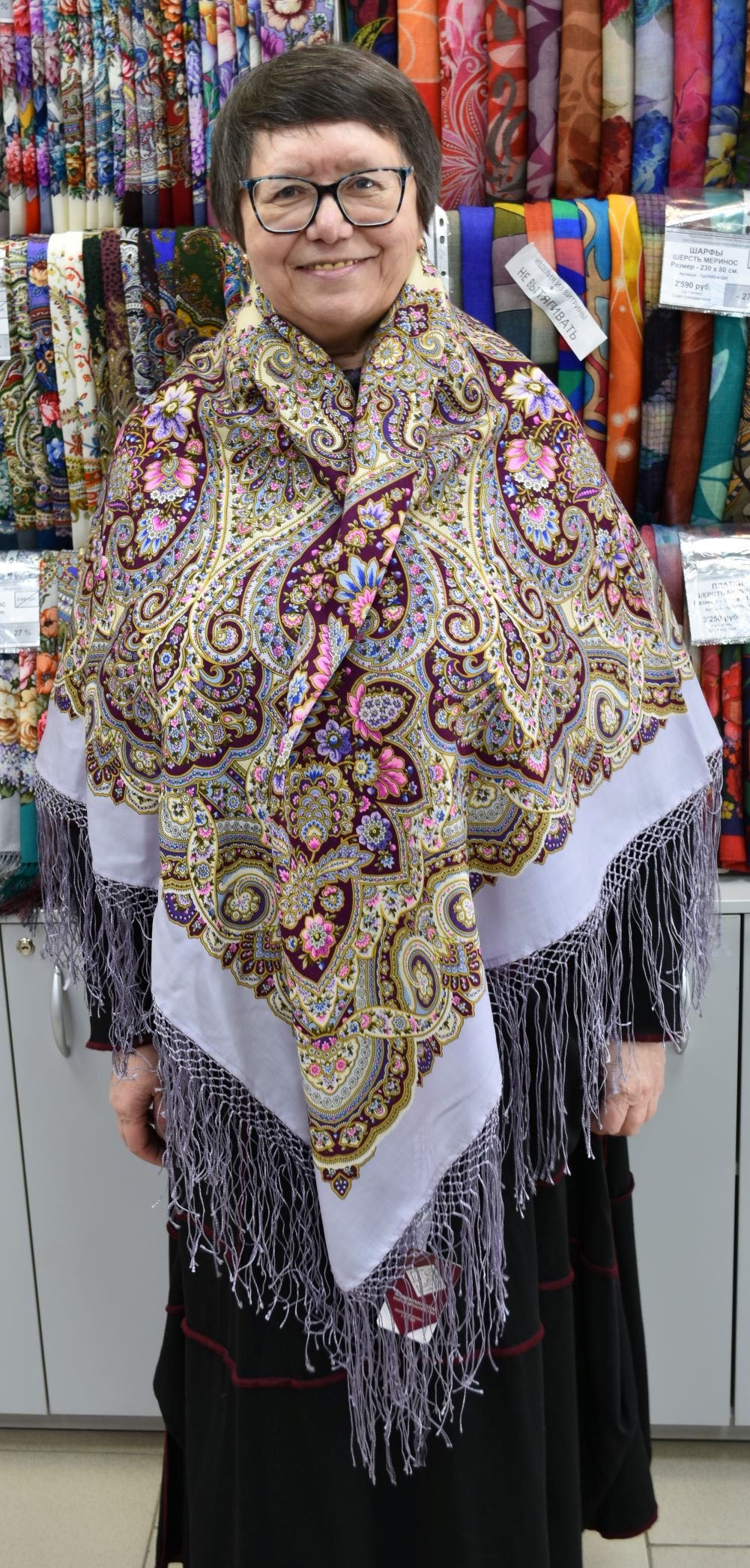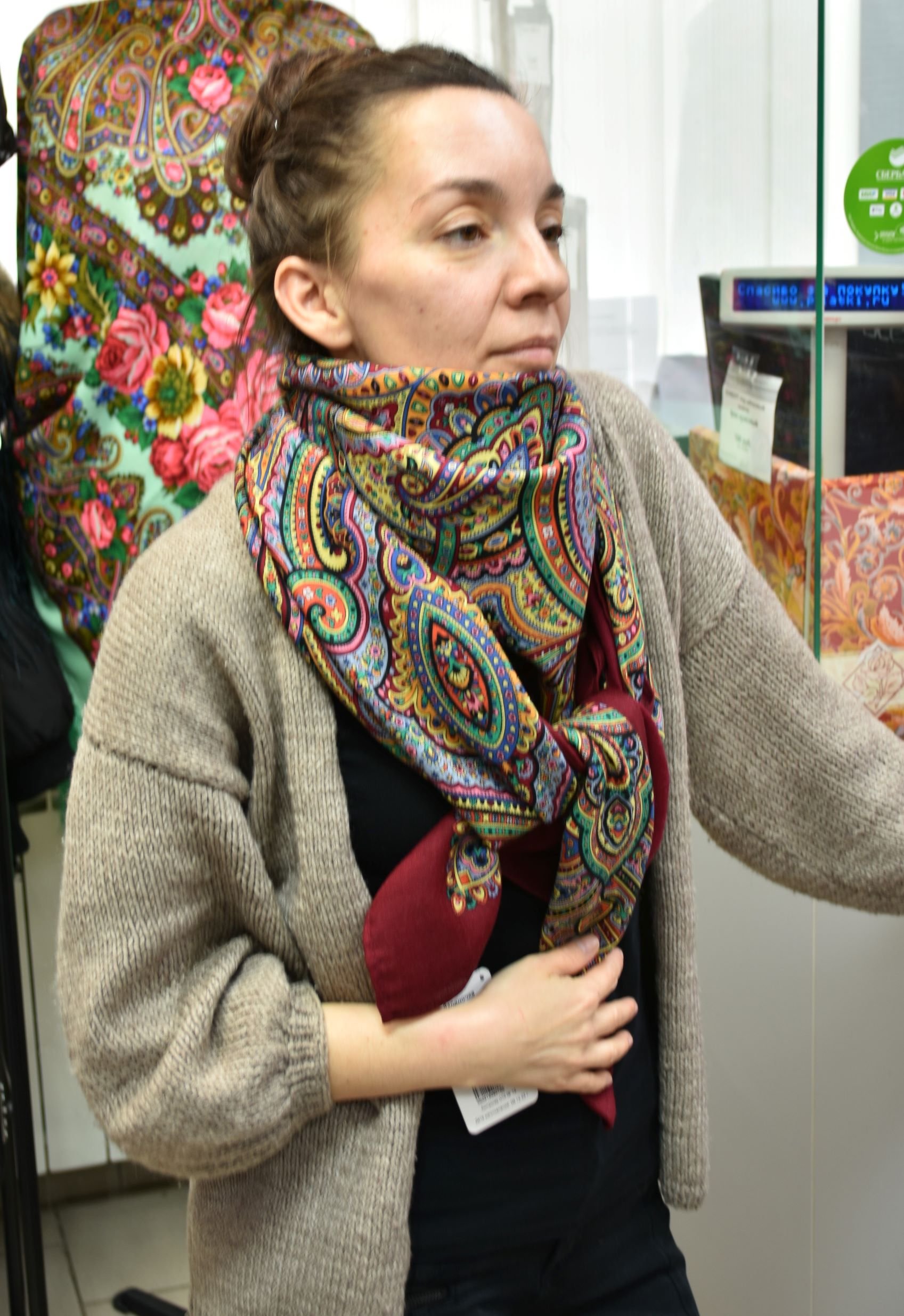 Я воспользовалась тем, что доступ к витрине с шелками освободился, прилипла к ней. Ну люблю я шелк! Примерила 3 крепдешиновых платочка. Названия у них, понятно, не фонтан, но сами платочки красивые.