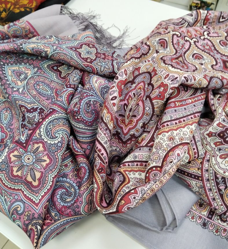 Прошу прощения, но и шаль, и платок малость помяты. Последние экземпляры, сняли с витрины, поэтому немного такие.