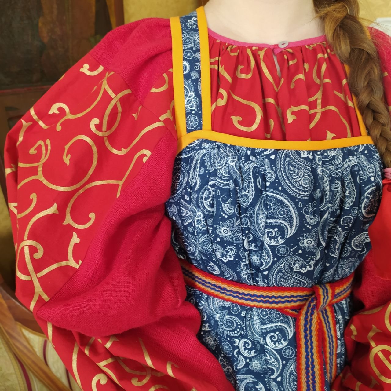Комплект с сарафаном- шубейкой и рубахой с поликами готов и я его примерила хозяйка - моя младшая дочка. Чтобы приблизиться, насколько возможно, к историческому прототипу все сборки, горловины, талийки , лягушки , словом, все главные узлы я шила вручную. Но боковые швы сарафана и отделка низа - машинная строчка. Ткань для сарафана очень радует, она максимально похожа на кубовую набойку, хотя "родом" она скандинавская. Следуя логике исторической народной колористики, отделка на синем сарафане - контрастная, оранжевая. Кстати, этот оттенок оранжевого, цвет спелого абрикоса - это знаменитый в свое время оттенок "танго". Когда в начале 20 века этот танец, тогда считавшийся вообще-то неприличным, вошел в моду, то вместе с ним вошли в моду платья определенного фасона - платья-танго. И шились они из черного и именно этого оттенка оранжевого. Цвет "танго" был так моден, что использовался повсеместно. В интерьере, в одежде, даже в оформлении конфетных коробок. Но я отвлеклась. Кроме оранжевого добавила розовую полоску, чтобы объединить с рубашкой , и потому, что это тоже в логике традиционного подхода - когда есть остатки, они идут в ход для отделки.