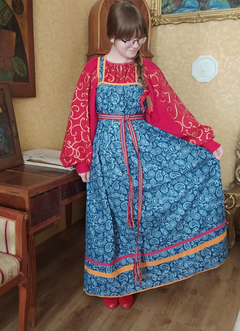Комплект с сарафаном- шубейкой и рубахой с поликами готов и я его примерила хозяйка - моя младшая дочка. Чтобы приблизиться, насколько возможно, к историческому прототипу все сборки, горловины, талийки , лягушки , словом, все главные узлы я шила вручную. Но боковые швы сарафана и отделка низа - машинная строчка. Ткань для сарафана очень радует, она максимально похожа на кубовую набойку, хотя "родом" она скандинавская. Следуя логике исторической народной колористики, отделка на синем сарафане - контрастная, оранжевая. Кстати, этот оттенок оранжевого, цвет спелого абрикоса - это знаменитый в свое время оттенок "танго". Когда в начале 20 века этот танец, тогда считавшийся вообще-то неприличным, вошел в моду, то вместе с ним вошли в моду платья определенного фасона - платья-танго. И шились они из черного и именно этого оттенка оранжевого. Цвет "танго" был так моден, что использовался повсеместно. В интерьере, в одежде, даже в оформлении конфетных коробок. Но я отвлеклась. Кроме оранжевого добавила розовую полоску, чтобы объединить с рубашкой , и потому, что это тоже в логике традиционного подхода - когда есть остатки, они идут в ход для отделки.