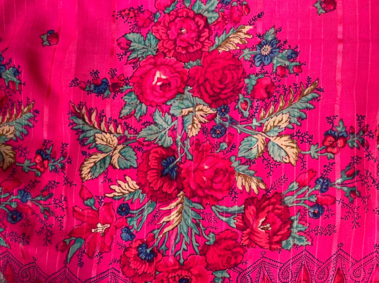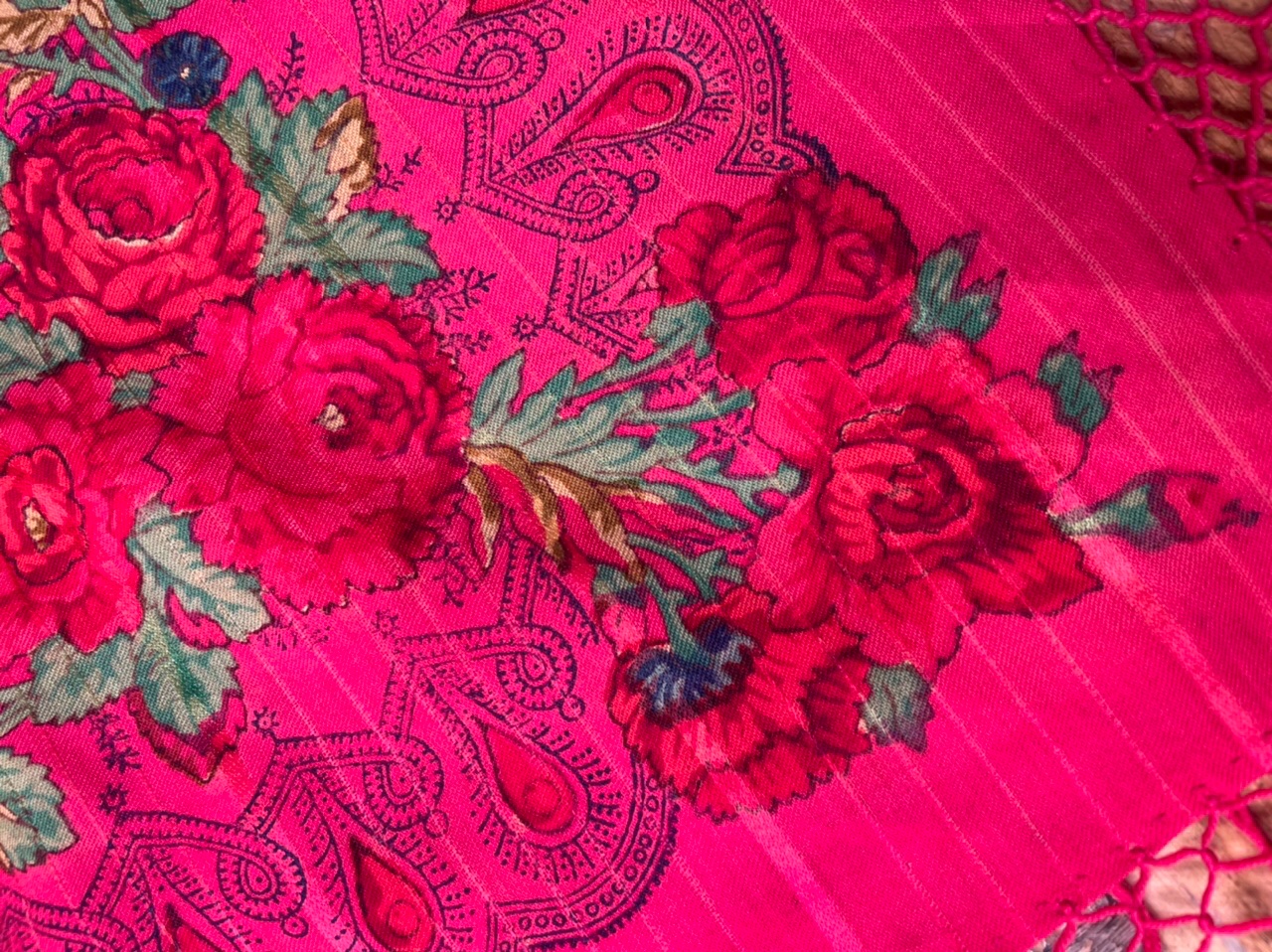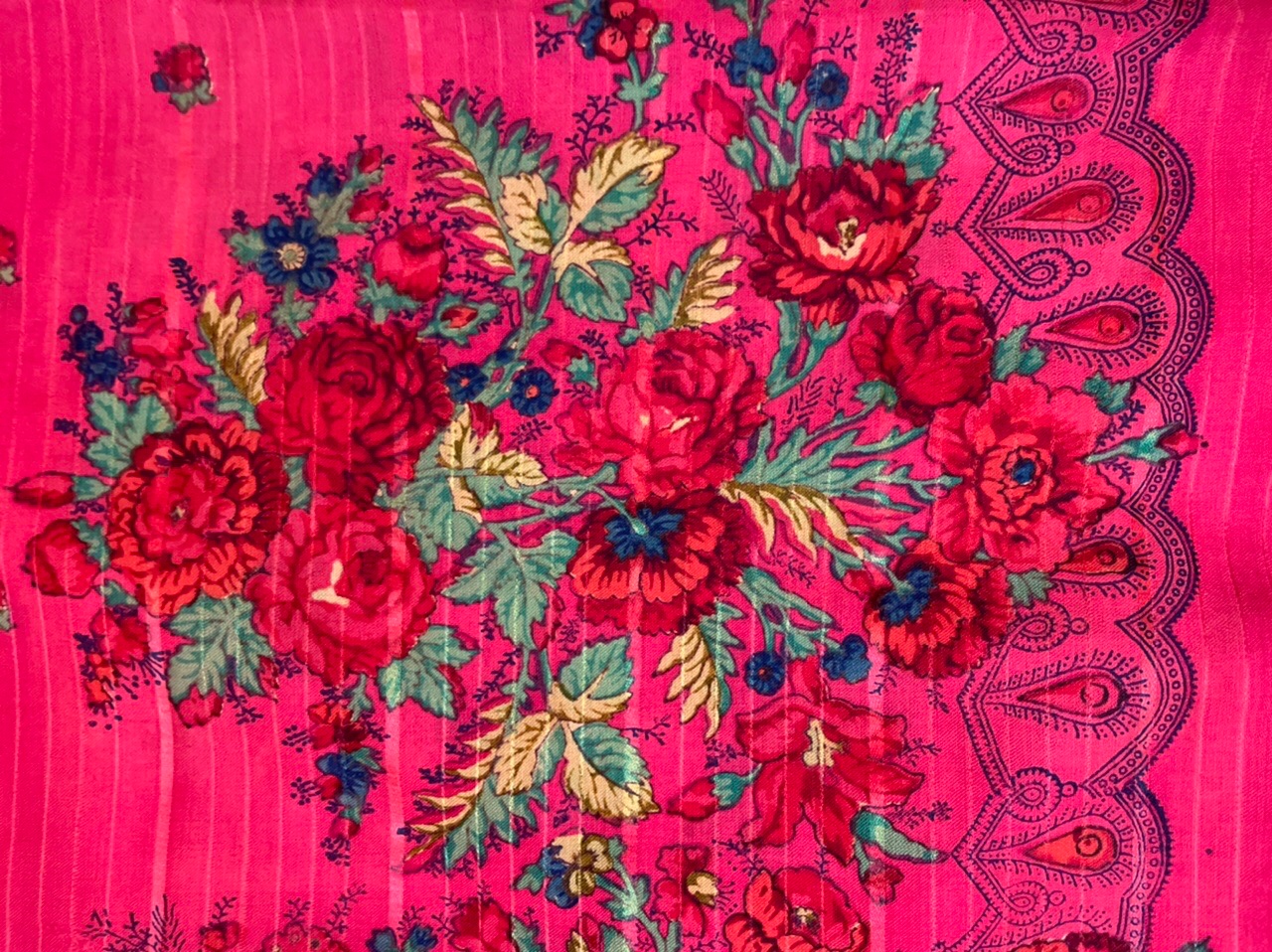 Гораздо перспективнее ориентироваться на технологические моменты - ткань полотна, подгибка, даже бахрома. Неслучайно Ковалева возлагает надежды на химический анализ платков (особенности сырья, красителей). Именно когда я это услышала - возрадовалась. Может быть, удастся раскидать безымянные дореволюционные платки хотя бы по фабрикам.