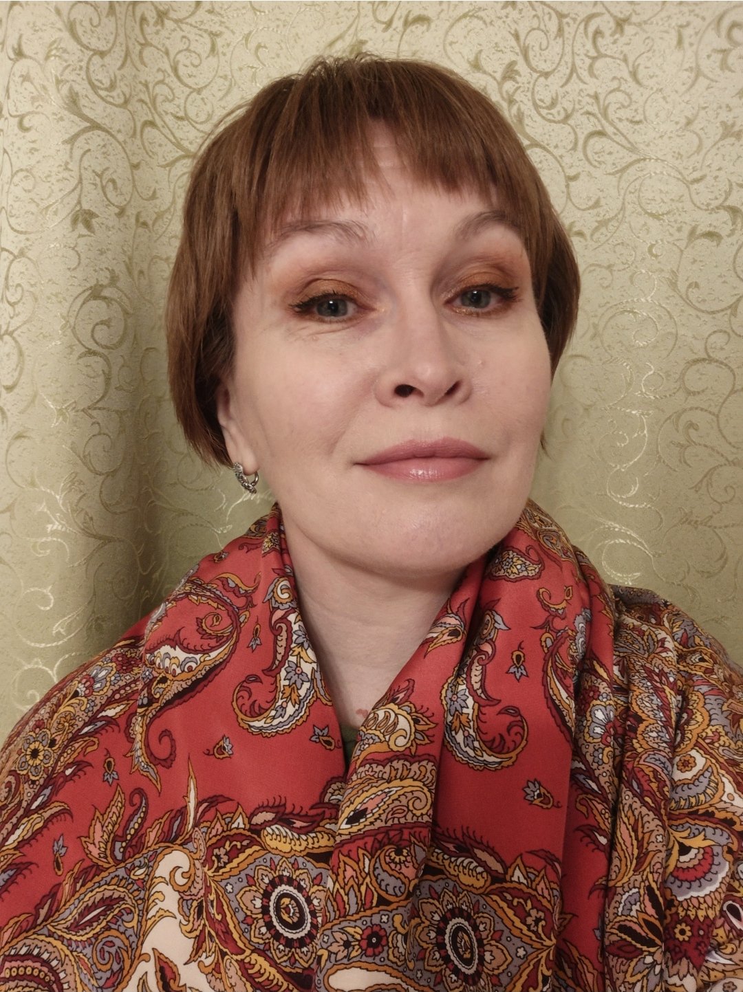Понравился приём в макияже -цветовой акцент во внутреннем уголке глаз. Особенно, когда глаза глубоко посажены и веко слегка нависает. И, конечно, в согласии с колоритом платка.