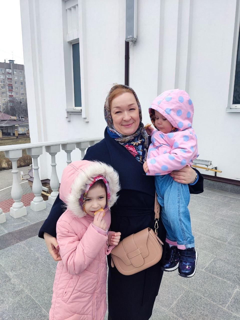 Мои любимые маленькие внученьки после причастия. Обе в ПП платочке. Но жалко, что их совсем не видно. На улице был сильный ветер.
