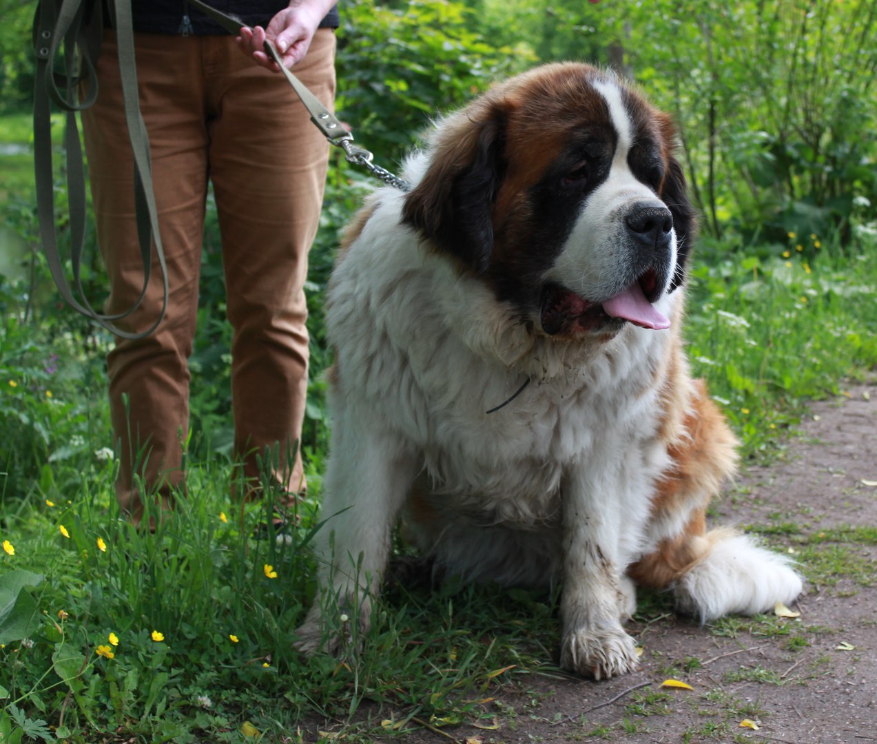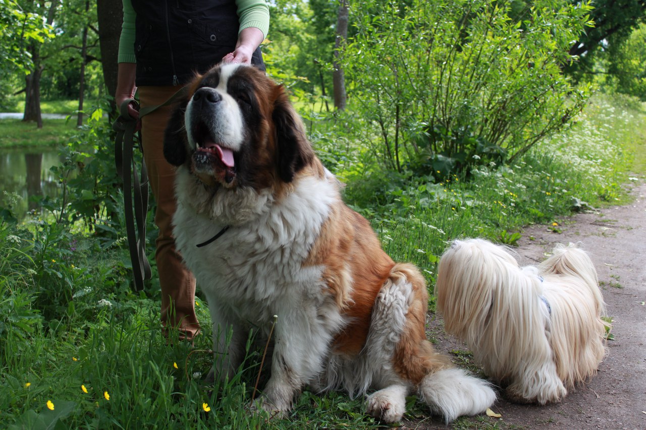Петергофские знакомства: огромная девочка сенбернар и её мелкий друг (хозяйка сказала- у нас таких нет, все диванные, а эта - из Сибири приехала)