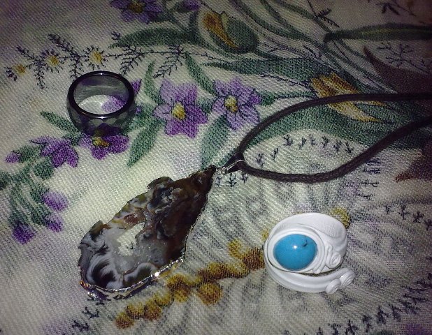 Сегодняшний улов на "Самоцветном развале": колечко из гематита, кулон - срез агата, кольцо из белой кожи и бирюзы. Носить, конечно, буду по отдельности -- и "Отрада" здесь просто служит фоном:)
