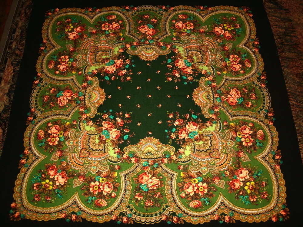 Кайма платка очень темная, кажется почти черной с небольшим намеком на зеленый.