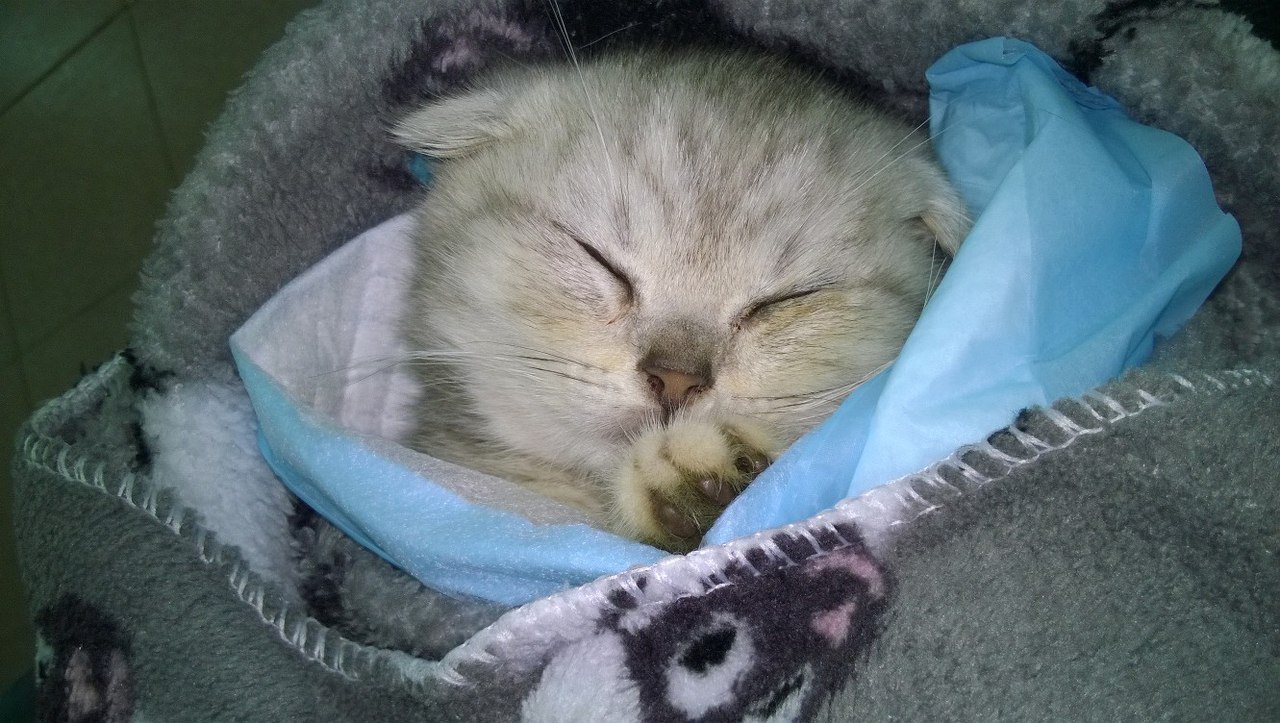 Вечером отправились к ветеринару, он вынес приговор - не жилец) "Не жилец" уснул после процедур и уколов и был сфотографирован)