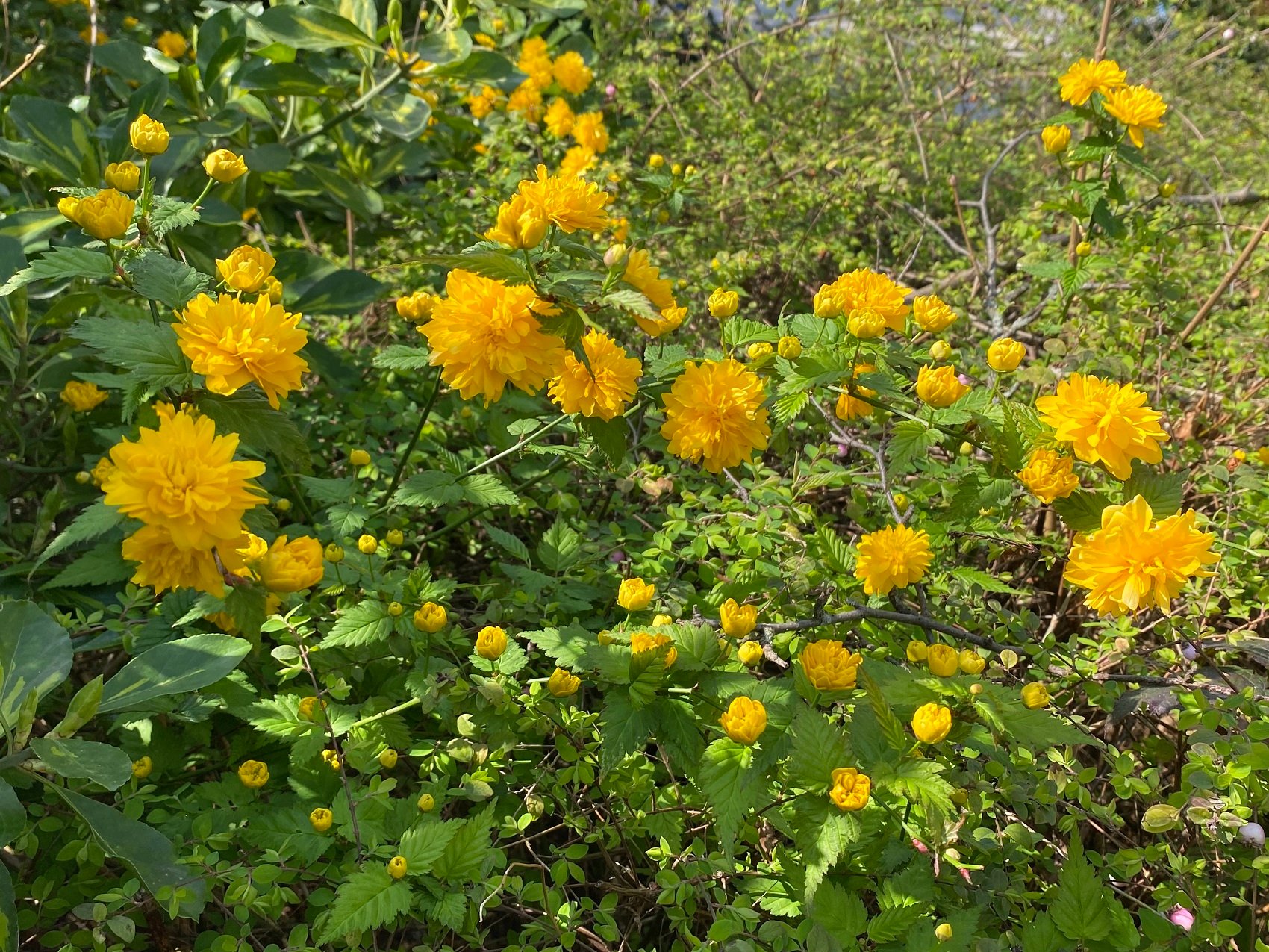Не знаю, как называется этот куст, цветки напоминают золотые шары, и по размеру примерно такие же.