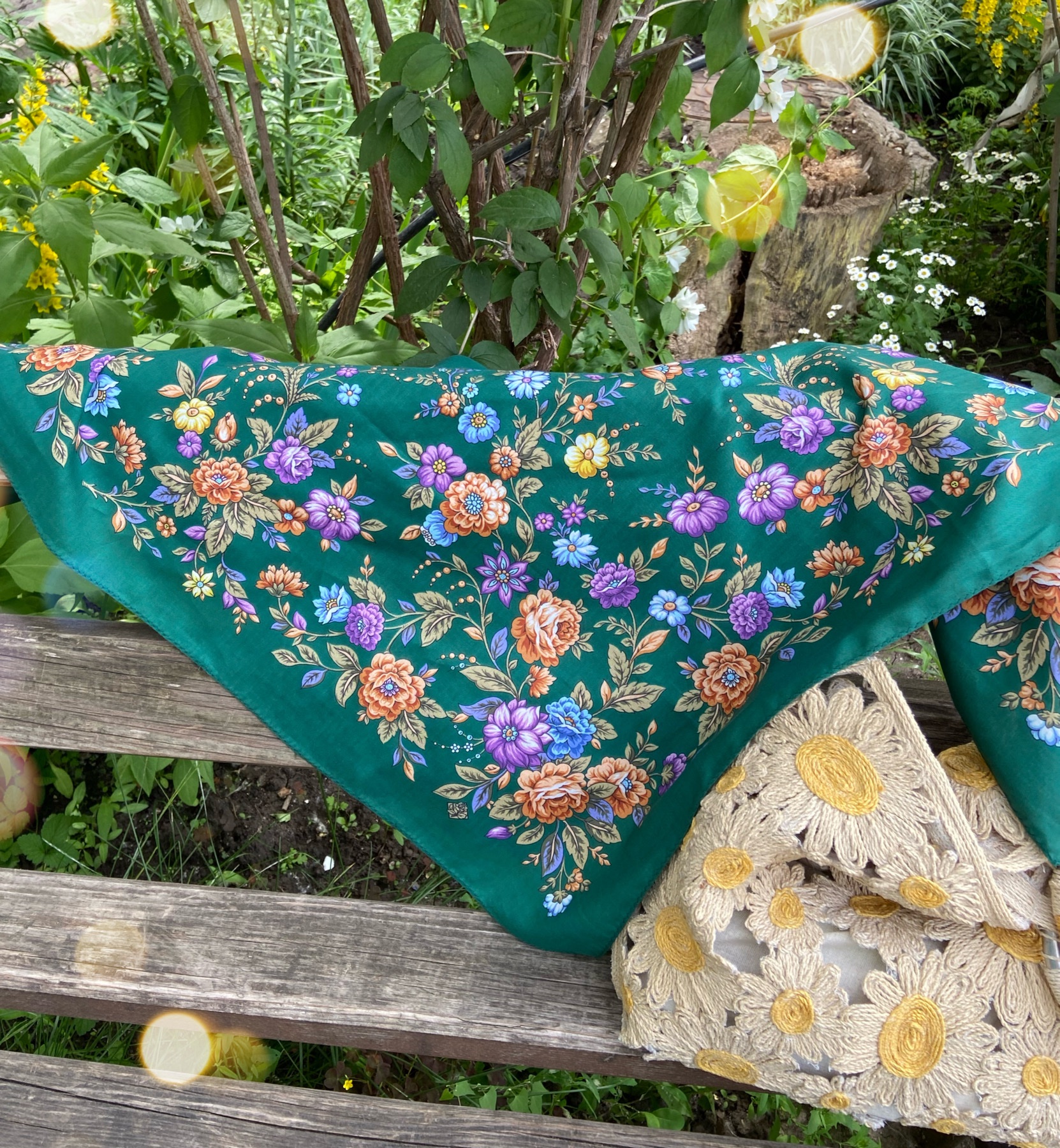 Хлопок зимой на голову не намотаешь. А эта шаль для меня - явный кусочек лета, законсервированный на зиму. Да, сливочная - воздушная, а эта как раз земная, стоишь на лугу и смотришь на него с высоты своего роста, а там трава сочная, цветочки разные, листва от жары потемнела, бабочки порхают! И все оттенки зелёного такие правильные, природные. У Златы Александровны все рисунки "живые". Только цена и останавливает.