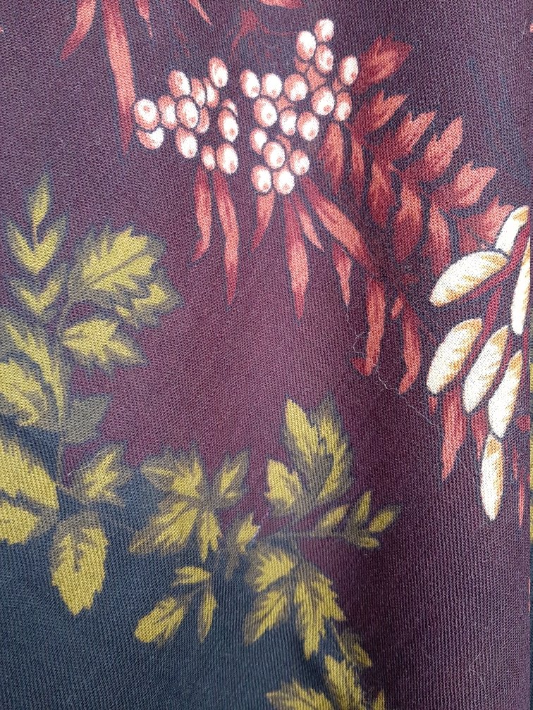 Вот фото платка "Рябина" по рисунку В.И.Зубрицкого в 20-м колорите. Печать 1999 г. Цветопередача не очень точная - теряется светло-желтый цвет крылаток, розоватый цвет ягод, и в целом платок кажется более припыленным, чем есть на самом деле.